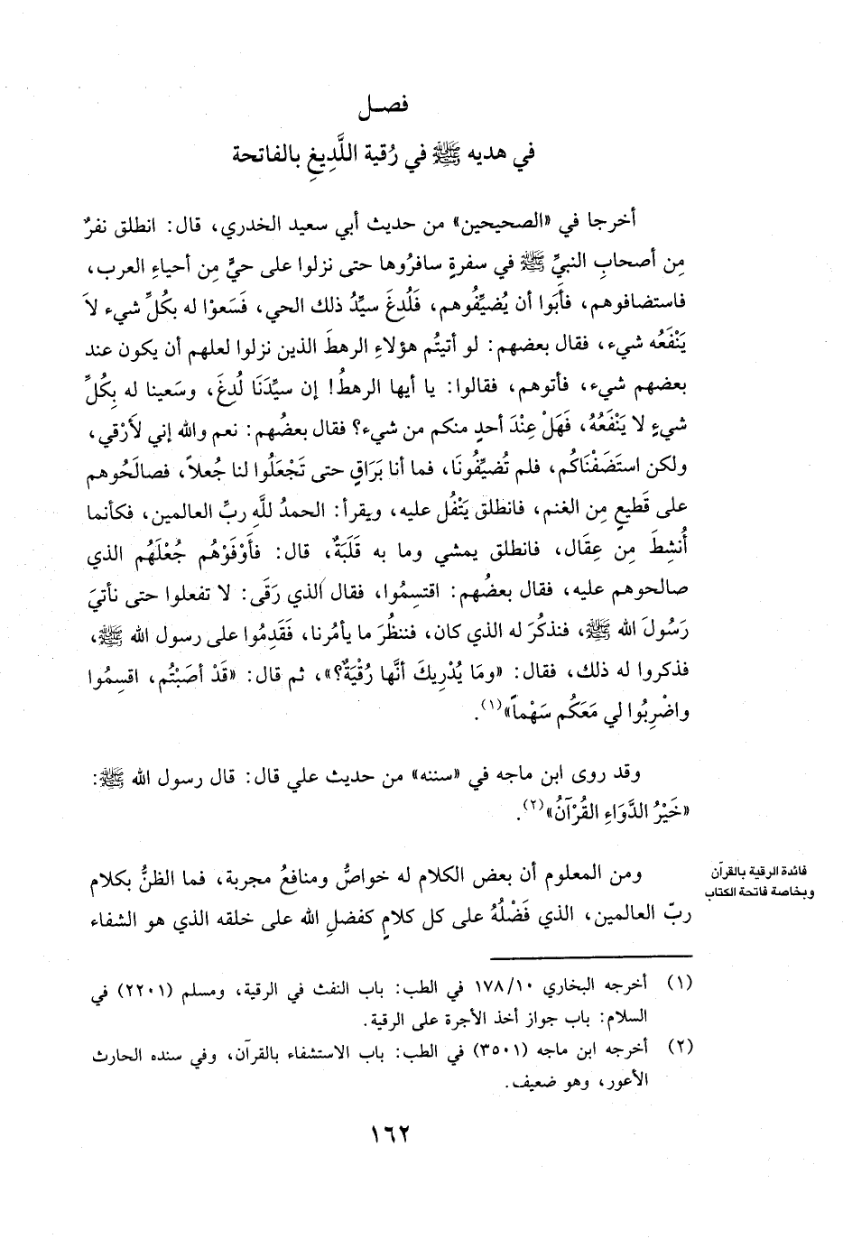 أَخْرَجَا فِي " الصَّحِيحَيْنِ " مِنْ حَدِيثِ أَبِي سَعِيدٍ الْخُدْرِيِّ، قَالَ: ( «انْطَلَقَ نَفَرٌ مِنْ أَصْحَابِ النَّبِيِّ - صَلَّى اللَّهُ عَلَيْهِ وَسَلَّمَ - فِي سَفْرَةٍ سَافَرُوهَا حَتَّى نَزَلُوا عَلَى حَيٍّ مِنْ أَحْيَاءِ الْعَرَبِ، فَاسْتَضَافُوهُمْ فَأَبَوْا أَنْ يُضَيِّفُوهُمْ فَلُدِغَ سَيِّدُ ذَلِكَ الْحَيِّ فَسَعَوْا لَهُ بِكُلِّ شَيْءٍ لَا يَنْفَعُهُ شَيْءٌ فَقَالَ بَعْضُهُمْ: لَوْ أَتَيْتُمْ هَؤُلَاءِ الرَّهْطَ الَّذِينَ نَزَلُوا لَعَلَّهُمْ أَنْ يَكُونَ عِنْدَ بَعْضِهِمْ شَيْءٌ فَأَتَوْهُمْ فَقَالُوا: يَا أَيُّهَا الرَّهْطُ إِنَّ سَيَّدَنَا لُدِغَ، وَسَعَيْنَا لَهُ بِكُلِّ شَيْءٍ لَا يَنْفَعُهُ، فَهَلْ عِنْدَ أَحَدٍ مِنْكُمْ مِنْ شَيْءٍ؟ فَقَالَ بَعْضُهُمْ: نَعَمْ وَاللَّهِ إِنِّي لَأَرْقِي، وَلَكِنِ اسْتَضَفْنَاكُمْ فَلَمْ تُضَيِّفُونَا فَمَا أَنَا بَرَاقٍ حَتَّى تَجْعَلُوا لَنَا جُعْلًا، فَصَالَحُوهُمْ عَلَى قَطِيعٍ مِنَ الْغَنَمِ، فَانْطَلَقَ يَتْفُلُ عَلَيْهِ، وَيَقْرَأُ: الْحَمْدُ لِلَّهِ رَبِّ الْعَالَمِينَ، فَكَأَنَّمَا أُنْشِطَ مِنْ عِقَالٍ، فَانْطَلَقَ يَمْشِي، وَمَا بِهِ قَلَبَةٌ قَالَ: فَأَوْفَوْهُمْ جُعْلَهُمُ الَّذِي صَالَحُوهُمْ عَلَيْهِ، فَقَالَ بَعْضُهُمْ: اقْتَسِمُوا فَقَالَ الَّذِي رَقَى: لَا تَفْعَلُوا حَتَّى نَأْتِيَ رَسُولَ اللَّهِ - صَلَّى اللَّهُ عَلَيْهِ وَسَلَّمَ - فَنَذْكُرَ لَهُ الَّذِي كَانَ، فَنَنْظُرَ مَا يَأْمُرُنَا، فَقَدِمُوا عَلَى رَسُولِ اللَّهِ - صَلَّى اللَّهُ عَلَيْهِ وَسَلَّمَ - فَذَكَرُوا لَهُ ذَلِكَ فَقَالَ: " وَمَا يُدْرِيكَ أَنَّهَا رُقْيَةٌ؟ " ثُمَّ قَالَ: قَدْ أَصَبْتُمْ، اقْسِمُوا وَاضْرِبُوا لِي مَعَكُمْ سَهْمًا» ) .