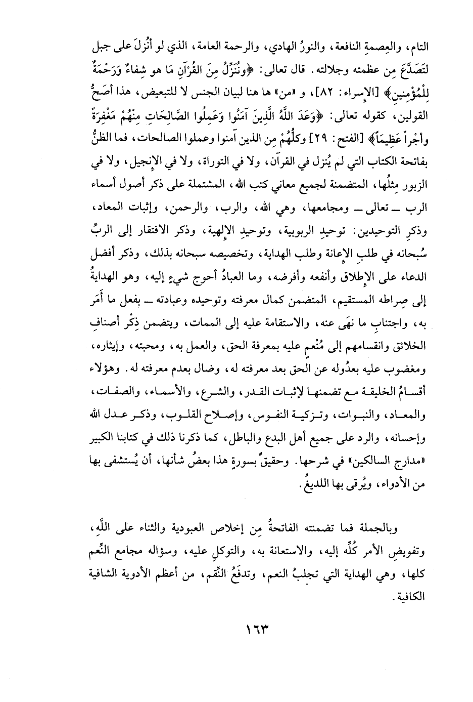 وَبِالْجُمْلَةِ فَمَا تَضَمَّنَتْهُ الْفَاتِحَةُ مِنْ إِخْلَاصِ الْعُبُودِيَّةِ وَالثَّنَاءِ عَلَى اللَّهِ، وَتَفْوِيضِ الْأَمْرِ كُلِّهِ إِلَيْهِ، وَالِاسْتِعَانَةِ بِهِ، وَالتَّوَكُّلِ عَلَيْهِ، وَسُؤَالِهِ مَجَامِعَ النِّعَمِ كُلِّهَا، وَهِيَ الْهِدَايَةُ الَّتِي تَجْلِبُ النِّعَمَ، وَتَدْفَعُ النِّقَمَ مِنْ أَعْظَمِ الْأَدْوِيَةِ الشَّافِيَةِ الْكَافِيَةِ.