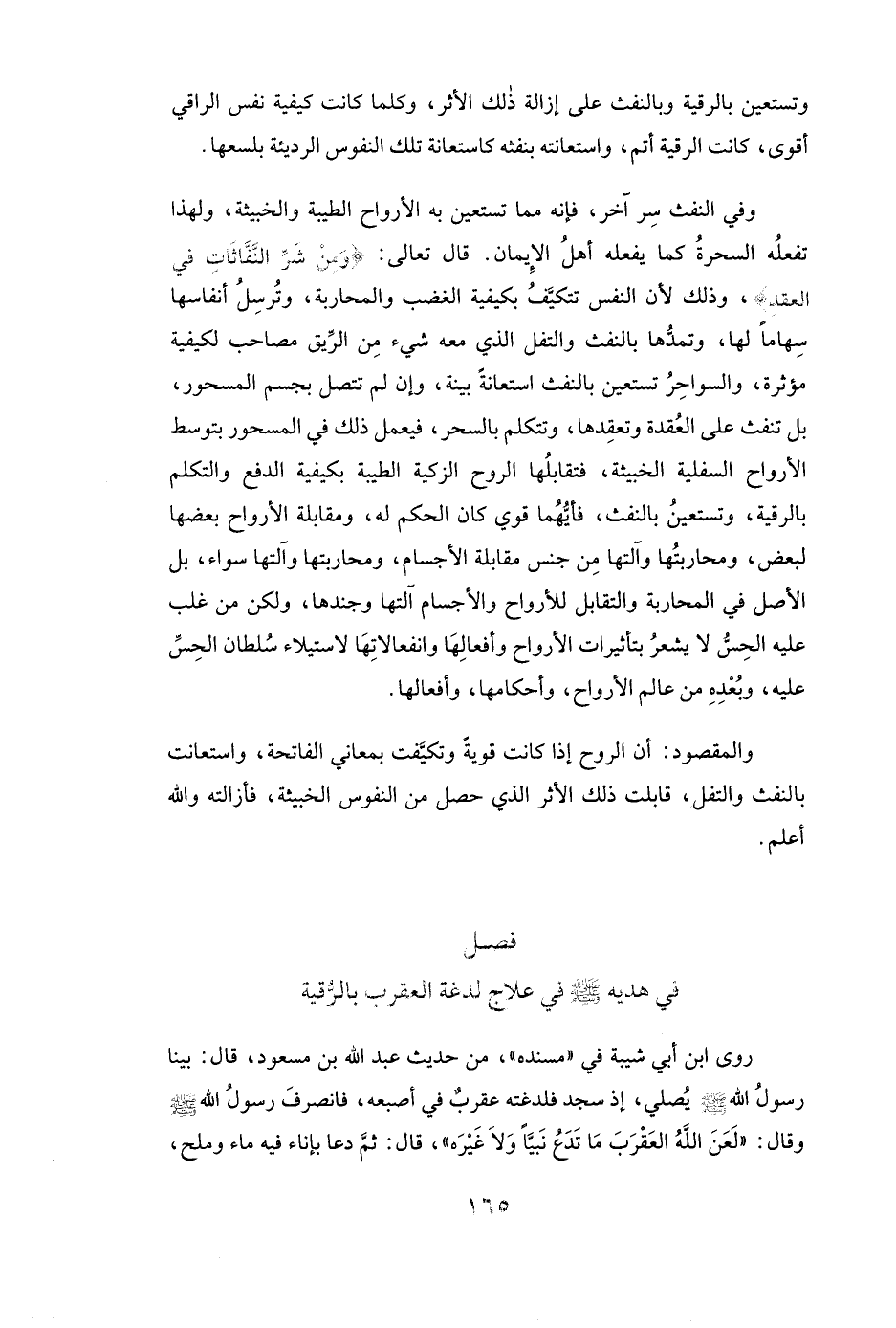 وَتَسْتَعِينُ بِالرُّقْيَةِ وَبِالنَّفْثِ عَلَى إِزَالَةِ ذَلِكَ الْأَثَرِ، وَكُلَّمَا كَانَتْ كَيْفِيَّةُ نَفْسِ الرَّاقِي أَقْوَى كَانَتِ الرُّقْيَةُ أَتَمَّ، وَاسْتِعَانَتُهُ بِنَفْثِهِ كَاسْتِعَانَةِ تِلْكَ النُّفُوسِ الرَّدِيئَةِ بِلَسْعِهَا.