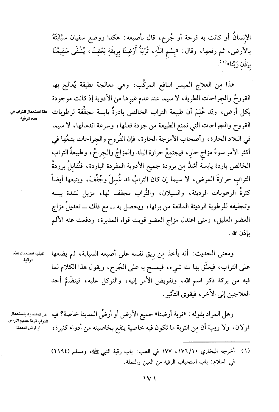 هَذَا مِنَ الْعِلَاجِ الْمُيَسَّرِ النَّافِعِ الْمُرَكَّبِ، وَهِيَ مُعَالَجَةٌ لَطِيفَةٌ يُعَالَجُ بِهَا الْقُرُوحُ وَالْجِرَاحَاتُ الطَّرِيَّةُ، لَا سِيَّمَا عِنْدَ عَدَمِ غَيْرِهَا مِنَ الْأَدْوِيَةِ إِذْ كَانَتْ مَوْجُودَةً بِكُلِّ أَرْضٍ، وَقَدْ عُلِمَ أَنَّ طَبِيعَةَ التُّرَابِ الْخَالِصِ بَارِدَةٌ يَابِسَةٌ مُجَفَّفَةٌ لِرُطُوبَاتِ الْقُرُوحِ وَالْجِرَاحَاتِ الَّتِي تَمْنَعُ الطَّبِيعَةُ مِنْ جَوْدَةِ فِعْلِهَا، وَسُرْعَةِ انْدِمَالِهَا، لَا سِيَّمَا فِي الْبِلَادِ الْحَارَّةِ، وَأَصْحَابِ الْأَمْزِجَةِ الْحَارَّةِ، فَإِنَّ الْقُرُوحَ وَالْجِرَاحَاتِ يَتْبَعُهَا فِي أَكْثَرِ الْأَمْرِ سُوءُ مِزَاجٍ حَارٍّ، فَيَجْتَمِعُ حَرَارَةُ الْبَلَدِ وَالْمِزَاجُ وَالْجِرَاحُ، وَطَبِيعَةُ التُّرَابِ الْخَالِصِ بَارِدَةٌ يَابِسَةٌ أَشَدُّ مِنْ بُرُودَةِ جَمِيعِ الْأَدْوِيَةِ الْمُفْرَدَةِ الْبَارِدَةِ، فَتُقَابِلُ بُرُودَةُ التُّرَابِ حَرَارَةَ الْمَرَضِ، لَا سِيَّمَا إِنْ كَانَ التُّرَابُ قَدْ غُسِلَ وَجُفِّفَ، وَيَتْبَعُهَا أَيْضًا كَثْرَةُ الرُّطُوبَاتِ الرَّدِيئَةِ، وَالسَّيَلَانُ، وَالتُّرَابُ مُجَفِّفٌ لَهَا، مُزِيلٌ لِشِدَّةِ يُبْسِهِ، وَتَجْفِيفِهِ لِلرُّطُوبَةِ الرَّدِيئَةِ الْمَانِعَةِ مِنْ بَرْئِهَا، وَيَحْصُلُ بِهِ - مَعَ ذَلِكَ - تَعْدِيلُ مِزَاجِ الْعُضْوِ الْعَلِيلِ، وَمَتَى اعْتَدَلَ مِزَاجُ الْعُضْوِ قَوِيَتْ قُوَاهُ الْمُدَبِّرَةُ، وَدَفَعَتْ عَنْهُ الْأَلَمَ بِإِذْنِ اللَّهِ.