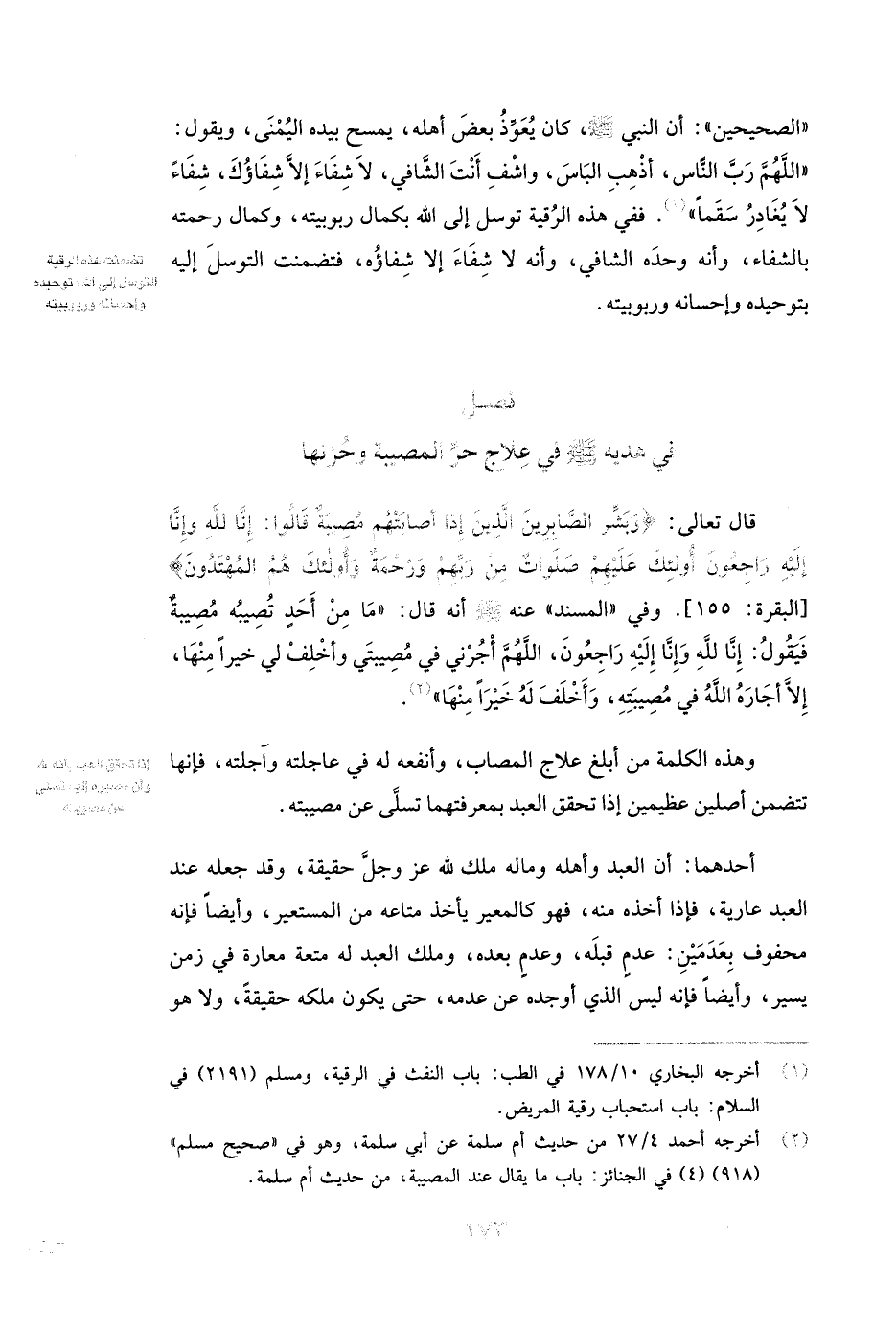 " الصَّحِيحَيْنِ ": ( «أَنَّ النَّبِيَّ - صَلَّى اللَّهُ عَلَيْهِ وَسَلَّمَ - كَانَ يُعَوِّذُ بَعْضَ أَهْلِهِ، يَمْسَحُ بِيَدِهِ الْيُمْنَى، وَيَقُولُ: " اللَّهُمَّ رَبَّ النَّاسِ أَذْهِبِ الْبَاسَ، وَاشْفِ أَنْتَ الشَّافِي لَا شِفَاءَ إِلَّا شِفَاؤُكَ، شِفَاءً لَا يُغَادِرُ سَقَمًا» ) ، فَفِي هَذِهِ الرُّقْيَةِ تَوَسُّلٌ إِلَى اللَّهِ بِكَمَالِ رُبُوبِيَّتِهِ، وَكَمَالِ رَحْمَتِهِ بِالشِّفَاءِ، وَأَنَّهُ وَحْدَهُ الشَّافِي، وَأَنَّهُ لَا شِفَاءَ إِلَّا شِفَاؤُهُ، فَتَضَمَّنَتِ التَّوَسُّلَ إِلَيْهِ بِتَوْحِيدِهِ وَإِحْسَانِهِ وَرُبُوبِيَّتِهِ.