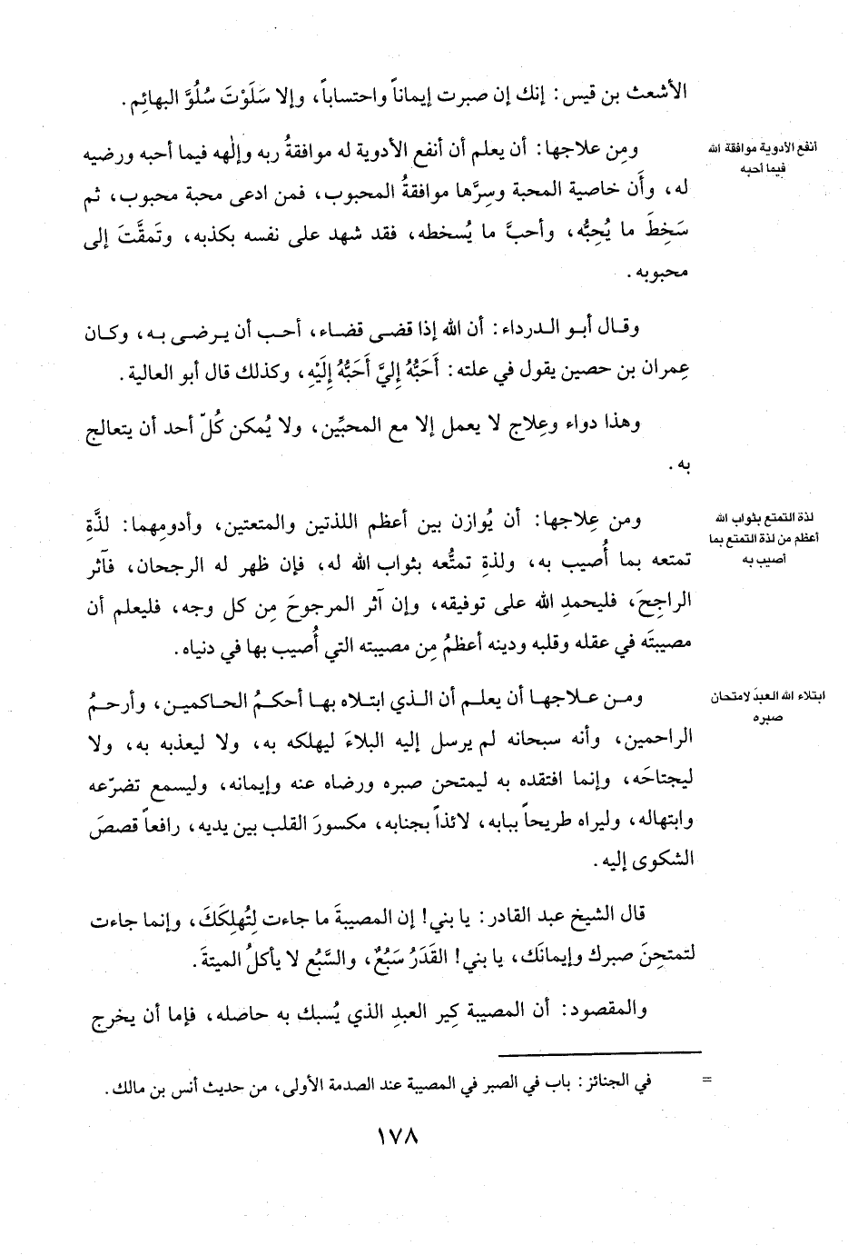وَمِنْ عِلَاجِهَا أَنْ يَعْلَمَ أَنَّ الَّذِي ابْتَلَاهُ بِهَا أَحْكَمُ الْحَاكِمِينَ، وَأَرْحَمُ الرَّاحِمِينَ، وَأَنَّهُ سُبْحَانَهُ لَمْ يُرْسِلْ إِلَيْهِ الْبَلَاءَ لِيُهْلِكَهُ بِهِ، وَلَا لِيُعَذِّبَهُ بِهِ، وَلَا لِيَجْتَاحَهُ، وَإِنَّمَا افْتَقَدَهُ بِهِ لِيَمْتَحِنَ صَبْرَهُ وَرِضَاهُ عَنْهُ وَإِيمَانَهُ وَلِيَسْمَعَ تَضَرُّعَهُ وَابْتِهَالَهُ، وَلِيَرَاهُ طَرِيحًا بِبَابِهِ لَائِذًا بِجَنَابِهِ مَكْسُورَ الْقَلْبِ بَيْنَ يَدَيْهِ رَافِعًا قَصَصَ الشَّكْوَى إِلَيْهِ.
