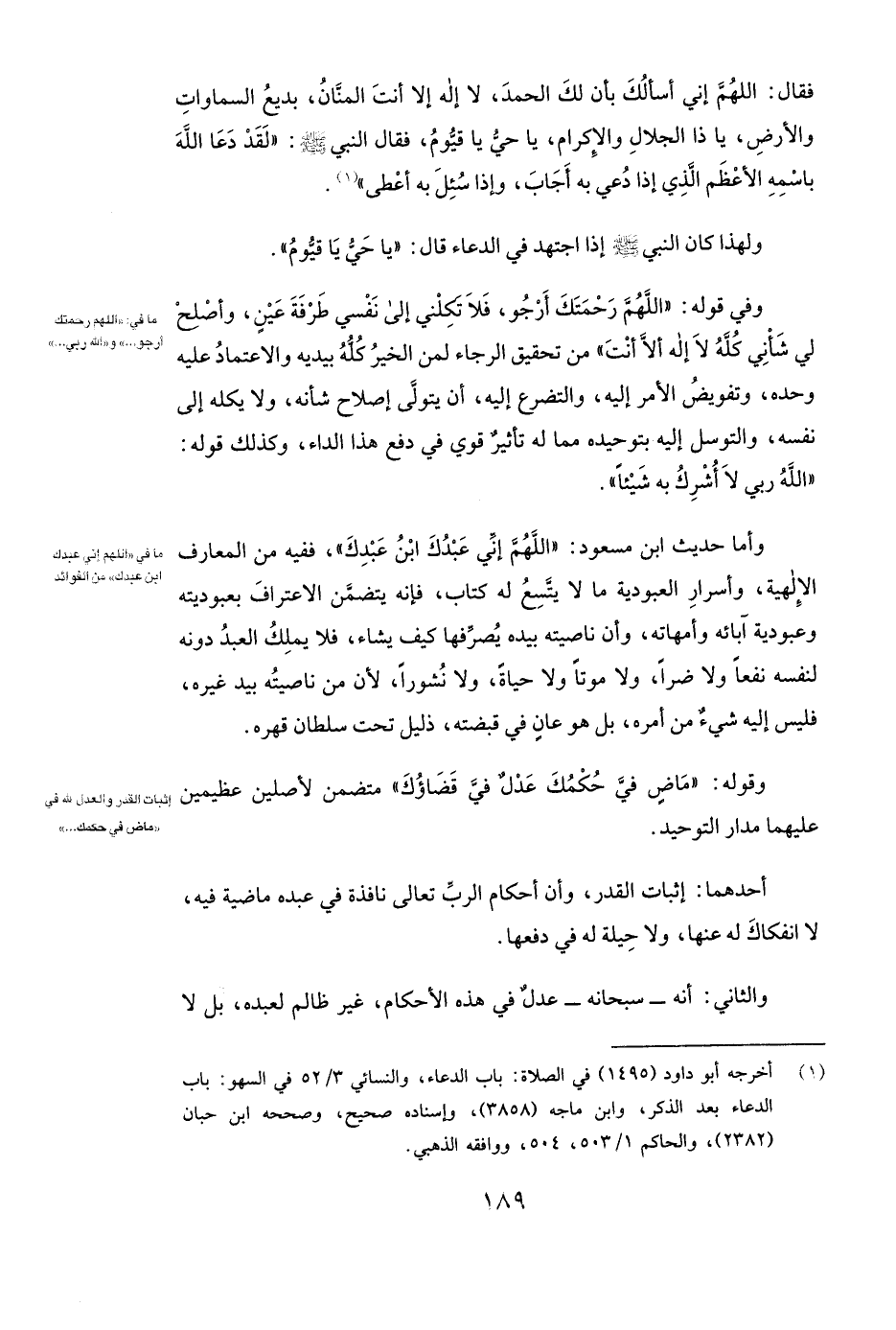 وَقَوْلُهُ: ( «مَاضٍ فِيَّ حُكْمُكَ عَدْلٌ فِيَّ قَضَاؤُكَ» ) مُتَضَمِّنٌ لِأَصْلَيْنِ عَظِيمَيْنِ عَلَيْهِمَا مَدَارُ التَّوْحِيدِ.