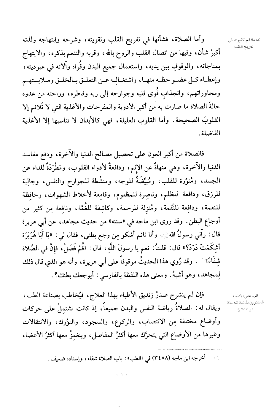 وَأَمَّا الصَّلَاةُ، فَشَأْنُهَا فِي تَفْرِيحِ الْقَلْبِ وَتَقْوِيتِهِ، وَشَرْحِهِ وَابْتِهَاجِهِ وَلَذَّتِهِ أَكْبَرُ شَأْنٍ، وَفِيهَا مِنَ اتِّصَالِ الْقَلْبِ وَالرُّوحِ بِاللَّهِ، وَقُرْبِهِ وَالتَّنَعُّمِ بِذِكْرِهِ، وَالِابْتِهَاجِ بِمُنَاجَاتِهِ، وَالْوُقُوفِ بَيْنَ يَدَيْهِ، وَاسْتِعْمَالِ جَمِيعِ الْبَدَنِ وَقُوَاهُ وَآلَاتِهِ فِي عُبُودِيَّتِهِ، وَإِعْطَاءِ كُلِّ عُضْوٍ حَظَّهُ مِنْهَا، وَاشْتِغَالِهِ عَنِ التَّعَلُّقِ بِالْخَلْقِ وَمُلَابَسَتِهِمْ وَمُحَاوَرَاتِهِمْ، وَانْجِذَابِ قُوَى قَلْبِهِ وَجَوَارِحِهِ إِلَى رَبِّهِ وَفَاطِرِهِ، وَرَاحَتِهِ مِنْ عَدُوِّهِ حَالَةَ الصَّلَاةِ مَا صَارَتْ بِهِ مِنْ أَكْبَرِ الْأَدْوِيَةِ وَالْمُفَرِّحَاتِ وَالْأَغْذِيَةِ الَّتِي لَا تُلَائِمُ إِلَّا الْقُلُوبَ الصَّحِيحَةَ. وَأَمَّا الْقُلُوبُ الْعَلِيلَةُ، فَهِيَ كَالْأَبْدَانِ لَا تُنَاسِبُهَا إِلَّا الْأَغْذِيَةُ الْفَاضِلَةُ.