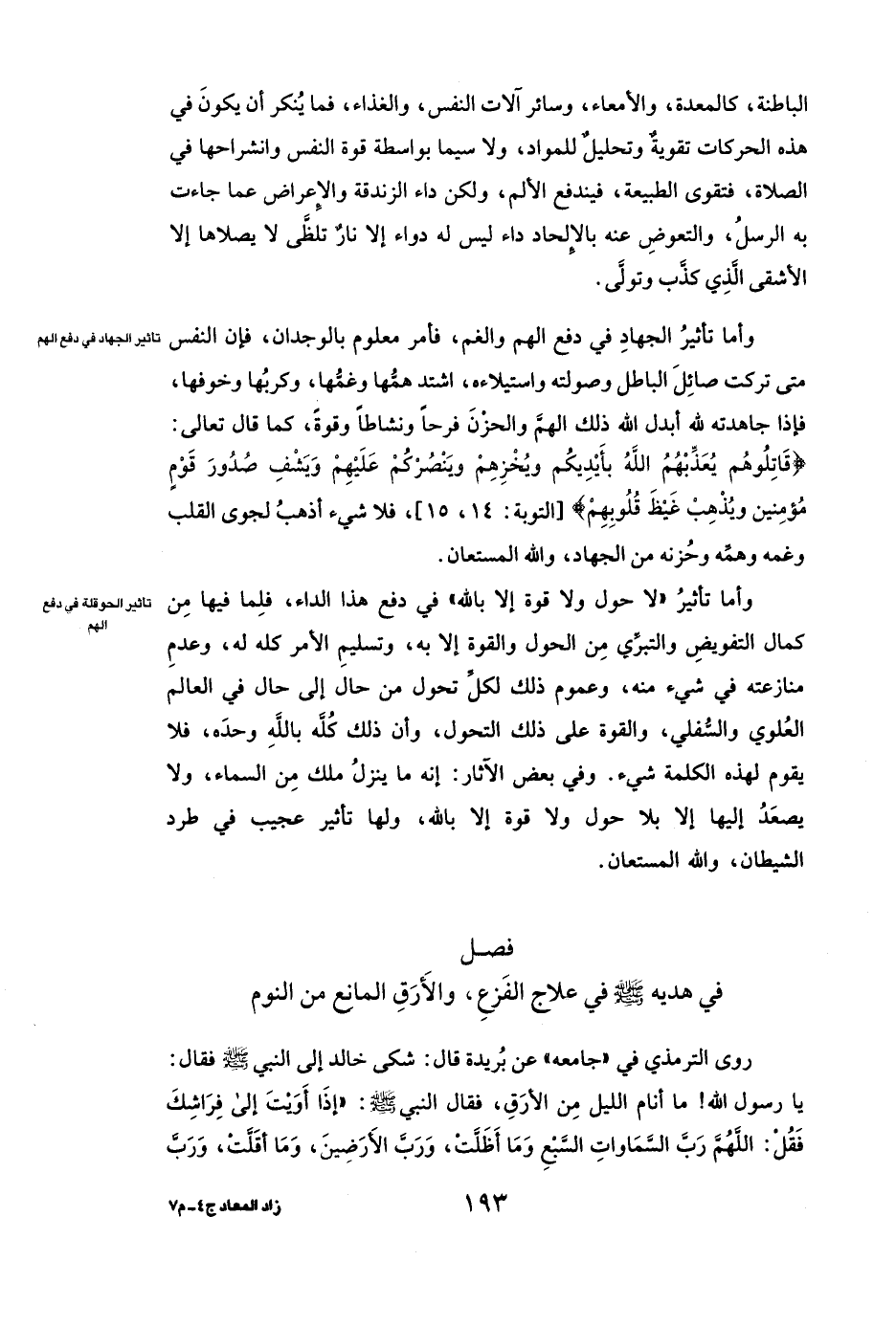 فِي هَدْيِهِ - صَلَّى اللَّهُ عَلَيْهِ وَسَلَّمَ - فِي عِلَاجِ الْفَزَعِ وَالْأَرَقِ الْمَانِعِ مِنَ النَّوْمِ