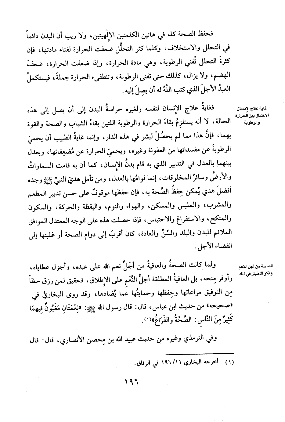 وَلَمَّا كَانَتِ الصِّحَّةُ وَالْعَافِيَةُ مِنْ أَجَلِّ نِعَمِ اللَّهِ عَلَى عَبْدِهِ، وَأَجْزَلِ عَطَايَاهُ، وَأَوْفَرِ مِنَحِهِ، بَلِ الْعَافِيَةُ الْمُطْلَقَةُ أَجَلُّ النِّعَمِ عَلَى الْإِطْلَاقِ، فَحَقِيقٌ لِمَنْ رُزِقَ حَظًّا مِنَ التَّوْفِيقِ مُرَاعَاتُهَا وَحِفْظُهَا وَحِمَايَتُهَا عَمَّا يُضَادُّهَا، وَقَدْ رَوَى الْبُخَارِيُّ فِي " صَحِيحِهِ " مِنْ حَدِيثِ ابْنِ عَبَّاسٍ قَالَ: قَالَ رَسُولُ اللَّهِ - صَلَّى اللَّهُ عَلَيْهِ وَسَلَّمَ: ( «نِعْمَتَانِ مَغْبُونٌ فِيهِمَا كَثِيرٌ مِنَ النَّاسِ: الصِّحَّةُ وَالْفَرَاغُ» ) .