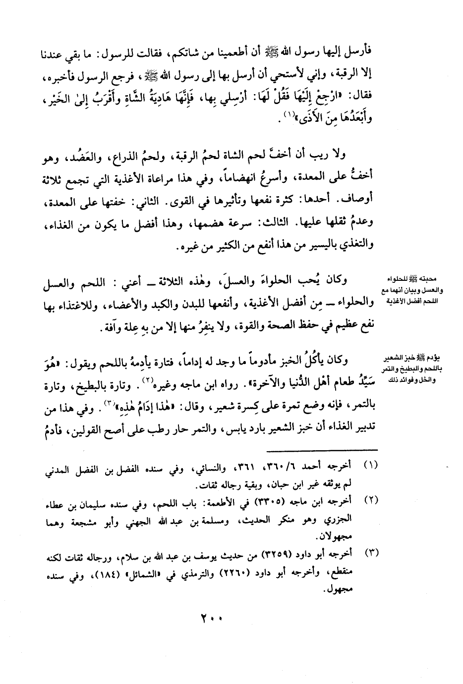 وَلَا رَيْبَ أَنَّ أَخَفَّ لَحْمِ الشَّاةِ لَحْمُ الرَّقَبَةِ وَلَحْمُ الذِّرَاعِ، وَالْعَضُدِ وَهُوَ أَخَفُّ عَلَى الْمَعِدَةِ، وَأَسْرَعُ انْهِضَامًا، وَفِي هَذَا مُرَاعَاةُ الْأَغْذِيَةِ الَّتِي تَجْمَعُ ثَلَاثَةَ أَوْصَافٍ. أَحَدُهَا: كَثْرَةُ نَفْعِهَا وَتَأْثِيرِهَا فِي الْقُوَى. الثَّانِي: خِفَّتُهَا عَلَى الْمَعِدَةِ، وَعَدَمُ ثِقَلِهَا عَلَيْهَا. الثَّالِثُ: سُرْعَةُ هَضْمِهَا، وَهَذَا أَفْضَلُ مَا يَكُونُ مِنَ الْغِذَاءِ، وَالتَّغَذِّي بِالْيَسِيرِ مِنْ هَذَا أَنْفَعُ مِنَ الْكَثِيرِ مِنْ غَيْرِهِ.