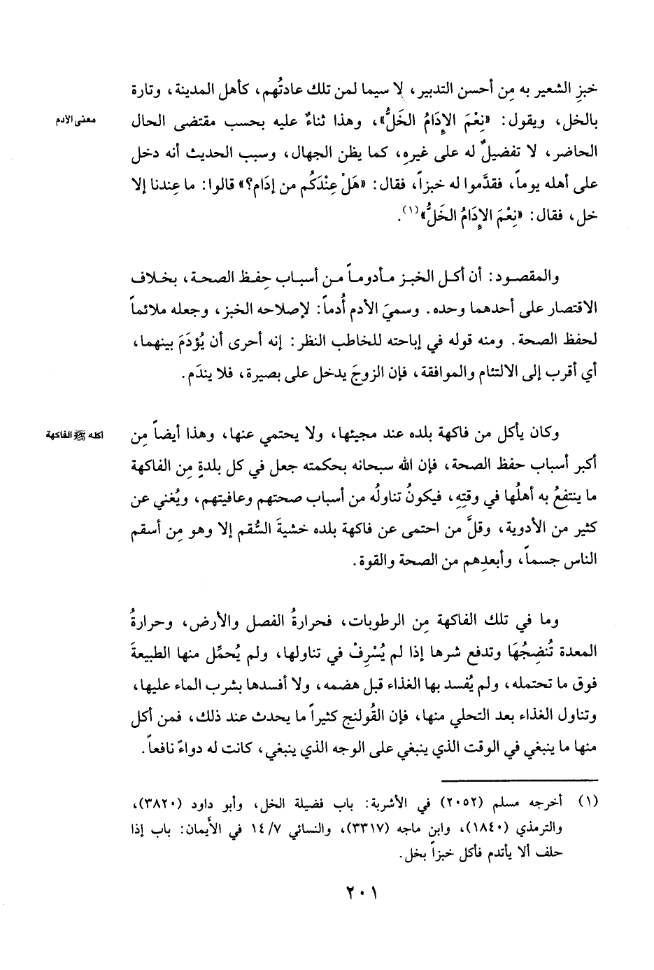 خُبْزِ الشَّعِيرِ بِهِ مِنْ أَحْسَنِ التَّدْبِيرِ، لَا سِيَّمَا لِمَنْ تِلْكَ عَادَتُهُمْ، كَأَهْلِ الْمَدِينَةِ، وَتَارَةً بِالْخَلِّ، وَيَقُولُ: ( «نِعْمَ الْإِدَامُ الْخَلُّ» ) ، وَهَذَا ثَنَاءٌ عَلَيْهِ بِحَسَبِ مُقْتَضَى الْحَالِ الْحَاضِرِ، لَا تَفْضِيلٌ لَهُ عَلَى غَيْرِهِ، كَمَا يَظُنُّ الْجُهَّالُ، وَسَبَبُ الْحَدِيثِ أَنَّهُ دَخَلَ عَلَى أَهْلِهِ يَوْمًا، فَقَدَّمُوا لَهُ خُبْزًا، فَقَالَ: (" «هَلْ عِنْدَكُمْ مِنْ إِدَامٍ؟ " قَالُوا: مَا عِنْدَنَا إِلَّا خَلٌّ، فَقَالَ: " نِعْمَ الْإِدَامُ الْخَلُّ» ") .