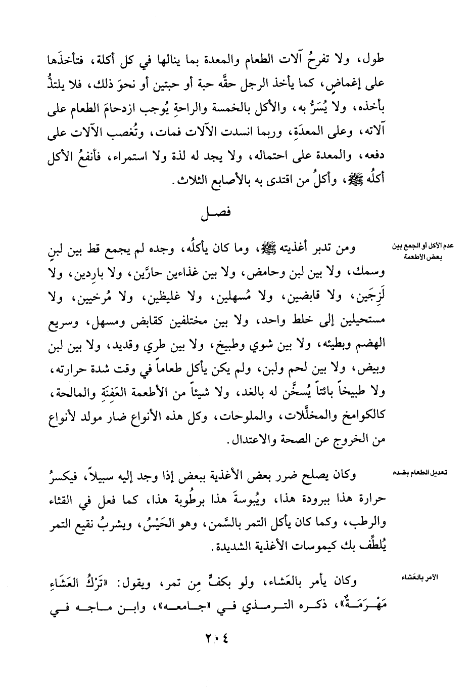 وَمَنْ تَدَبَّرَ أَغْذِيَتَهُ - صَلَّى اللَّهُ عَلَيْهِ وَسَلَّمَ، وَمَا كَانَ يَأْكُلُهُ، وَجَدَهُ لَمْ يَجْمَعْ قَطُّ بَيْنَ لَبَنٍ وَسَمَكٍ، وَلَا بَيْنَ لَبَنٍ وَحَامِضٍ، وَلَا بَيْنَ غِذَاءَيْنِ حَارَّيْنِ، وَلَا بَارِدَيْنِ، وَلَا لَزِجَيْنِ، وَلَا قَابِضَيْنِ، وَلَا مُسْهِلَيْنِ، وَلَا غَلِيظَيْنِ، وَلَا مُرْخِيَيْنِ، وَلَا مُسْتَحِيلَيْنِ إِلَى خَلْطٍ وَاحِدٍ، وَلَا بَيْنَ مُخْتَلِفَيْنِ كَقَابِضٍ وَمُسْهِلٍ، وَسَرِيعِ الْهَضْمِ وَبَطِيئِهِ، وَلَا بَيْنَ شَوِيٍّ وَطَبِيخٍ، وَلَا بَيْنَ طَرِيٍّ وَقَدِيدٍ، وَلَا بَيْنَ لَبَنٍ وَبَيْضٍ، وَلَا بَيْنَ لَحْمٍ وَلَبَنٍ، وَلَمْ يَكُنْ يَأْكُلُ طَعَامًا فِي وَقْتِ شِدَّةِ حَرَارَتِهِ، وَلَا طَبِيخًا بَائِتًا يُسَخَّنُ لَهُ بِالْغَدِ، وَلَا شَيْئًا مِنَ الْأَطْعِمَةِ الْعَفِنَةِ وَالْمَالِحَةِ، كَالْكَوَامِخِ وَالْمُخَلَّلَاتِ، وَالْمُلُوحَاتِ، وَكُلُّ هَذِهِ الْأَنْوَاعِ ضَارٌّ مُوَلِّدٌ لِأَنْوَاعٍ مِنَ الْخُرُوجِ عَنِ الصِّحَّةِ وَالِاعْتِدَالِ.