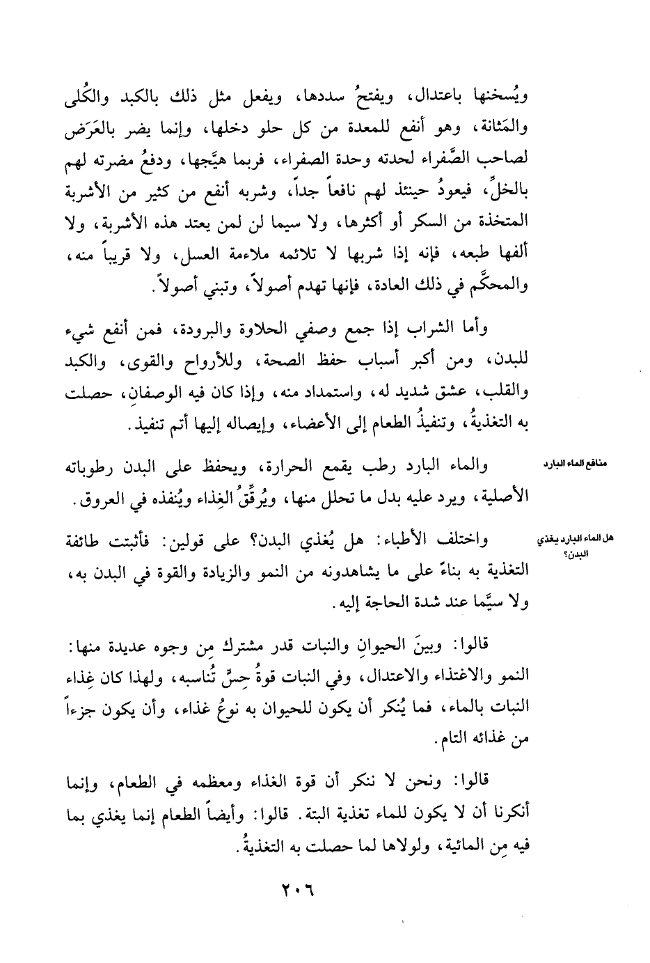 وَأَمَّا الشَّرَابُ إِذَا جُمِعَ وَصُفِّيَ الْحَلَاوَةُ وَالْبُرُودَةُ، فَمِنْ أَنْفَعِ شَيْءٍ لِلْبَدَنِ، وَمِنْ أَكْبَرِ أَسْبَابِ حِفْظِ الصِّحَّةِ، وَلِلْأَرْوَاحِ وَالْقُوَى وَالْكَبِدِ وَالْقَلْبِ عِشْقٌ شَدِيدٌ لَهُ، وَاسْتِمْدَادٌ مِنْهُ، وَإِذَا كَانَ فِيهِ الْوَصْفَانِ، حَصَلَتْ بِهِ التَّغْذِيَةُ، وَتَنْفِيذُ الطَّعَامِ إِلَى الْأَعْضَاءِ، وَإِيصَالُهُ إِلَيْهَا أَتَمَّ تَنْفِيذٍ.