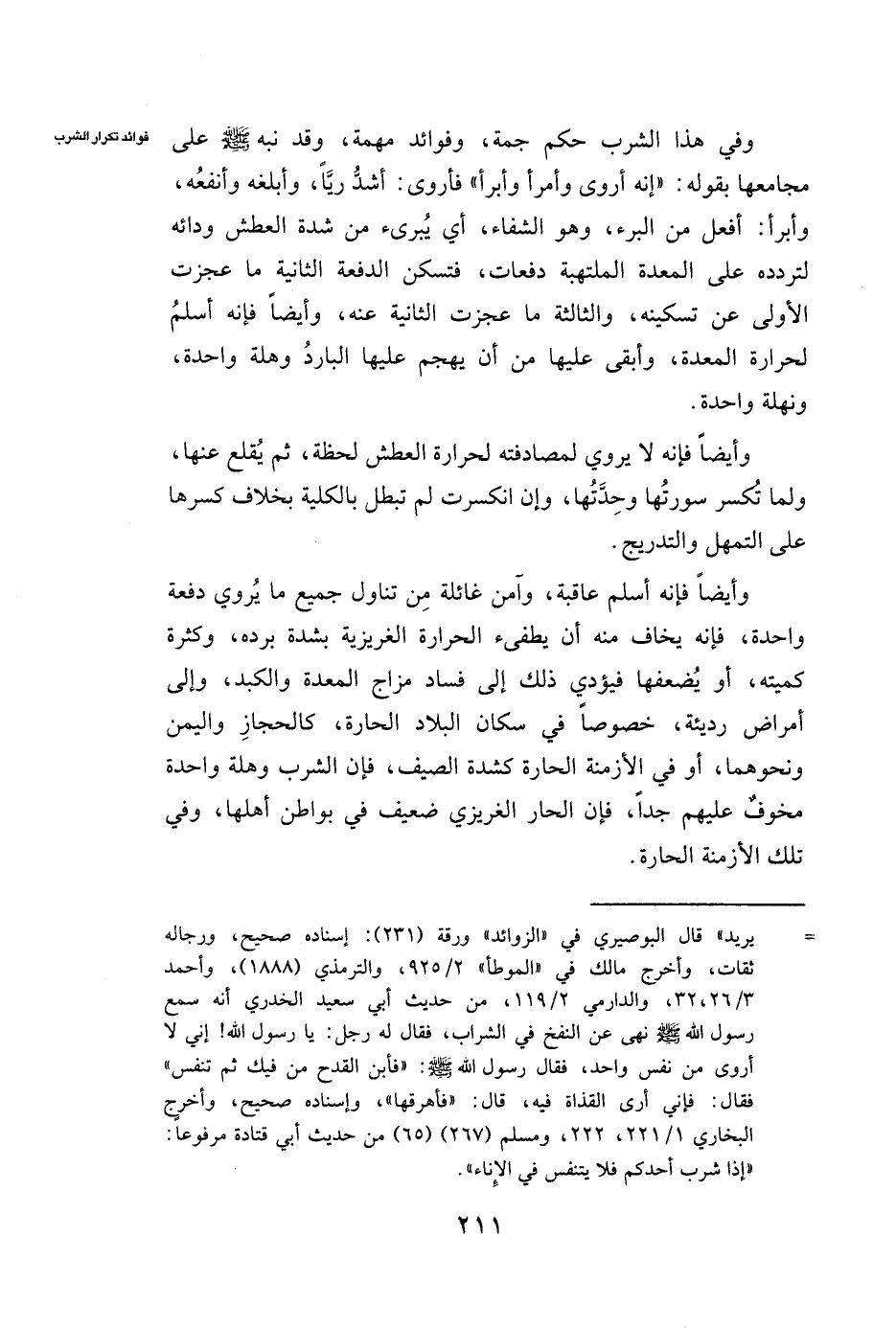 وَأَيْضًا فَإِنَّهُ أَسْلَمُ عَاقِبَةً، وَآمَنُ غَائِلَةً مِنْ تَنَاوُلِ جَمِيعِ مَا يُرْوِي دُفْعَةً وَاحِدَةً، فَإِنَّهُ يُخَافُ مِنْهُ أَنْ يُطْفِئَ الْحَرَارَةَ الْغَرِيزِيَّةَ بِشِدَّةِ بَرْدِهِ، وَكَثْرَةِ كَمِّيَّتِهِ، أَوْ يُضْعِفُهَا فَيُؤَدِّي ذَلِكَ إِلَى فَسَادِ مِزَاجِ الْمَعِدَةِ وَالْكَبِدِ، وَإِلَى أَمْرَاضٍ رَدِيئَةٍ، خُصُوصًا فِي سُكَّانِ الْبِلَادِ الْحَارَّةِ، كَالْحِجَازِ وَالْيَمَنِ وَنَحْوِهِمَا، أَوْ فِي الْأَزْمِنَةِ الْحَارَّةِ كَشِدَّةِ الصَّيْفِ، فَإِنَّ الشُّرْبَ وَهْلَةً وَاحِدَةً مَخُوفٌ عَلَيْهِمْ جِدًّا، فَإِنَّ الْحَارَّ الْغَرِيزِيَّ ضَعِيفٌ فِي بَوَاطِنِ أَهْلِهَا، وَفِي تِلْكَ الْأَزْمِنَةِ الْحَارَّةِ.
