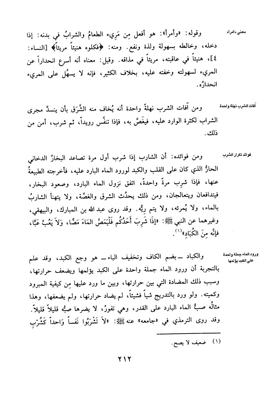 وَمِنْ فَوَائِدِهِ: أَنَّ الشَّارِبَ إِذَا شَرِبَ أَوَّلَ مَرَّةٍ تَصَاعَدَ الْبُخَارُ الدُّخَانِيُّ الْحَارُّ الَّذِي كَانَ عَلَى الْقَلْبِ وَالْكَبِدِ لِوُرُودِ الْمَاءِ الْبَارِدِ عَلَيْهِ، فَأَخْرَجَتْهُ الطَّبِيعَةُ عَنْهَا، فَإِذَا شَرِبَ مَرَّةً وَاحِدَةً اتَّفَقَ نُزُولُ الْمَاءِ الْبَارِدِ، وَصُعُودُ الْبُخَارِ، فَيَتَدَافَعَانِ وَيَتَعَالَجَانِ، وَمِنْ ذَلِكَ يَحْدُثُ الشَّرَقُ وَالْغُصَّةُ، وَلَا يَتَهَنَّأُ الشَّارِبُ بِالْمَاءِ، وَلَا يُمْرِئْهُ، وَلَا يَتِمُّ رِيُّهُ. وَقَدْ رَوَى عَبْدُ اللَّهِ بْنُ الْمُبَارَكِ، والبيهقي، وَغَيْرُهُمَا عَنِ النَّبِيِّ - صَلَّى اللَّهُ عَلَيْهِ وَسَلَّمَ: ( «إِذَا شَرِبَ أَحَدُكُمْ فَلْيَمُصَّ الْمَاءَ مَصًّا، وَلَا يَعُبَّ عَبًّا، فَإِنَّهُ مِنَ الْكُبَادِ» ) .