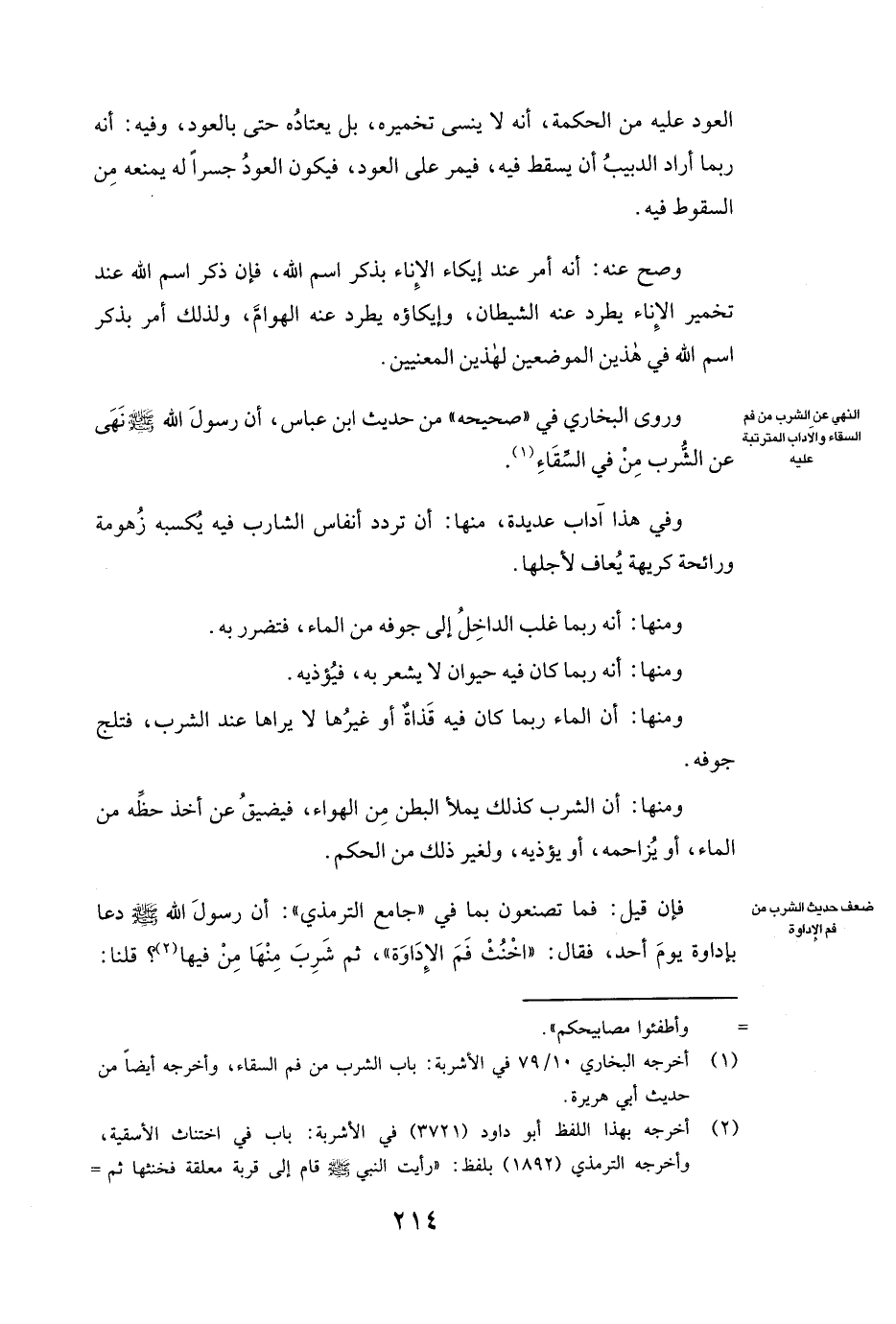 وَرَوَى الْبُخَارِيُّ فِي " صَحِيحِهِ " مِنْ حَدِيثِ ابْنِ عَبَّاسٍ أَنَّ رَسُولَ اللَّهِ - صَلَّى اللَّهُ عَلَيْهِ وَسَلَّمَ - ( «نَهَى عَنِ الشُّرْبِ مِنْ فِي السِّقَاءِ» ) .