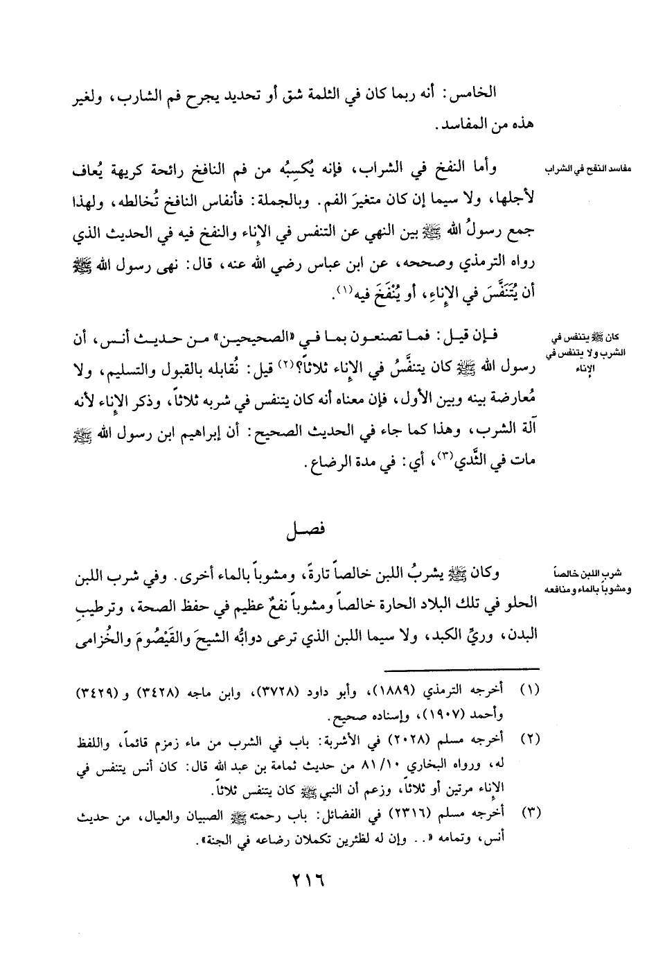 وَأَمَّا النَّفْخُ فِي الشَّرَابِ، فَإِنَّهُ يُكْسِبُهُ مِنْ فَمِ النَّافِخِ رَائِحَةً كَرِيهَةً يُعَافُ لِأَجْلِهَا، وَلَا سِيَّمَا إِنْ كَانَ مُتَغَيِّرَ الْفَمِ. وَبِالْجُمْلَةِ: فَأَنْفَاسُ النَّافِخِ تُخَالِطُهُ؛ وَلِهَذَا جَمَعَ رَسُولُ اللَّهِ - صَلَّى اللَّهُ عَلَيْهِ وَسَلَّمَ - بَيْنَ النَّهْيِ عَنِ التَّنَفُّسِ فِي الْإِنَاءِ وَالنَّفْخِ فِيهِ فِي الْحَدِيثِ الَّذِي رَوَاهُ الترمذي وَصَحَّحَهُ، عَنِ ابْنِ عَبَّاسٍ - رَضِيَ اللَّهُ عَنْهُ - قَالَ: ( «نَهَى رَسُولُ اللَّهِ - صَلَّى اللَّهُ عَلَيْهِ وَسَلَّمَ - أَنْ يُتَنَفَّسَ فِي الْإِنَاءِ، أَوْ يُنْفَخَ فِيهِ» ) .
