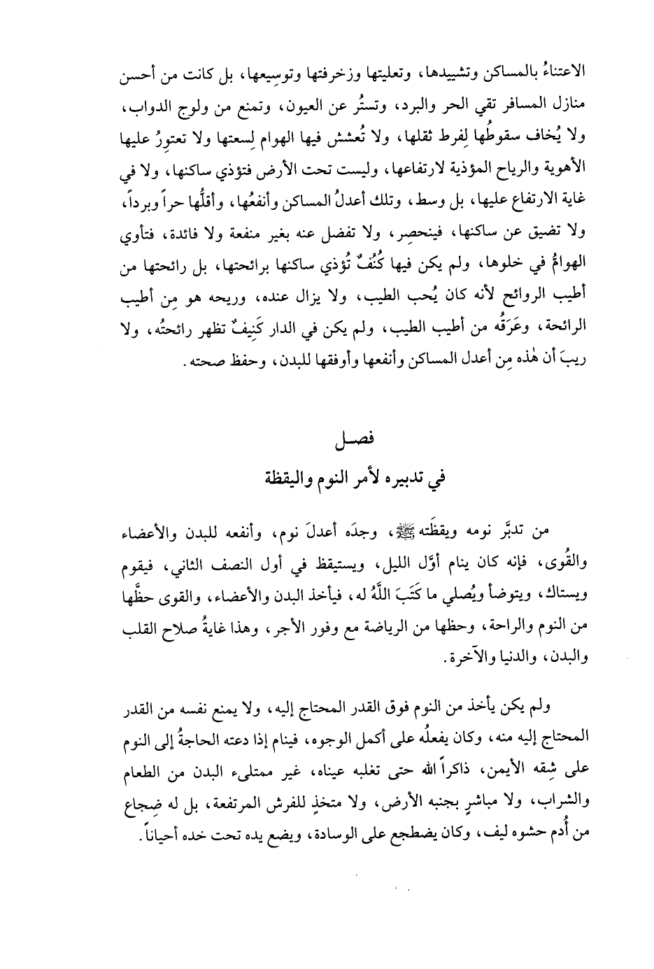 مَنْ تَدَبَّرَ نَوْمَهُ وَيَقَظَتَهُ - صَلَّى اللَّهُ عَلَيْهِ وَسَلَّمَ - وَجَدَهُ أَعْدَلَ نَوْمٍ، وَأَنْفَعَهُ لِلْبَدَنِ وَالْأَعْضَاءِ وَالْقُوَى، فَإِنَّهُ كَانَ يَنَامُ أَوَّلَ اللَّيْلِ، وَيَسْتَيْقِظُ فِي أَوَّلِ النِّصْفِ الثَّانِي، فَيَقُومُ وَيَسْتَاكُ، وَيَتَوَضَّأُ وَيُصَلِّي مَا كَتَبَ اللَّهُ لَهُ، فَيَأْخُذُ الْبَدَنُ وَالْأَعْضَاءُ، وَالْقُوَى حَظَّهَا مِنَ النَّوْمِ وَالرَّاحَةِ، وَحَظَّهَا مِنَ الرِّيَاضَةِ مَعَ وُفُورِ الْأَجْرِ، وَهَذَا غَايَةُ صَلَاحِ الْقَلْبِ وَالْبَدَنِ، وَالدُّنْيَا وَالْآخِرَةِ.