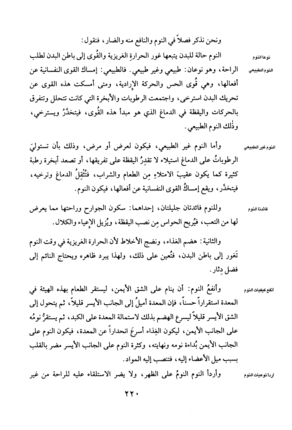 النَّوْمُ حَالَةٌ لِلْبَدَنِ يَتْبَعُهَا غَوْرُ الْحَرَارَةِ الْغَرِيزِيَّةِ وَالْقُوَى إِلَى بَاطِنِ الْبَدَنِ لِطَلَبِ الرَّاحَةِ، وَهُوَ نَوْعَانِ: طَبِيعِيٌّ، وَغَيْرُ طَبِيعِيٍّ. فَالطَّبِيعِيُّ إِمْسَاكُ الْقُوَى النَّفْسَانِيَّةِ عَنْ أَفْعَالِهَا، وَهِيَ قُوَى الْحِسِّ وَالْحَرَكَةِ الْإِرَادِيَّةِ، وَمَتَى أَمْسَكَتْ هَذِهِ الْقُوَى عَنْ تَحْرِيكِ الْبَدَنِ اسْتَرْخَى، وَاجْتَمَعَتِ الرُّطُوبَاتُ وَالْأَبْخِرَةُ الَّتِي كَانَتْ تَتَحَلَّلُ وَتَتَفَرَّقُ بِالْحَرَكَاتِ وَالْيَقَظَةِ فِي الدِّمَاغِ الَّذِي هُوَ مَبْدَأُ هَذِهِ الْقُوَى فَيَتَخَدَّرُ وَيَسْتَرْخِي، وَذَلِكَ النَّوْمُ الطَّبِيعِيُّ.