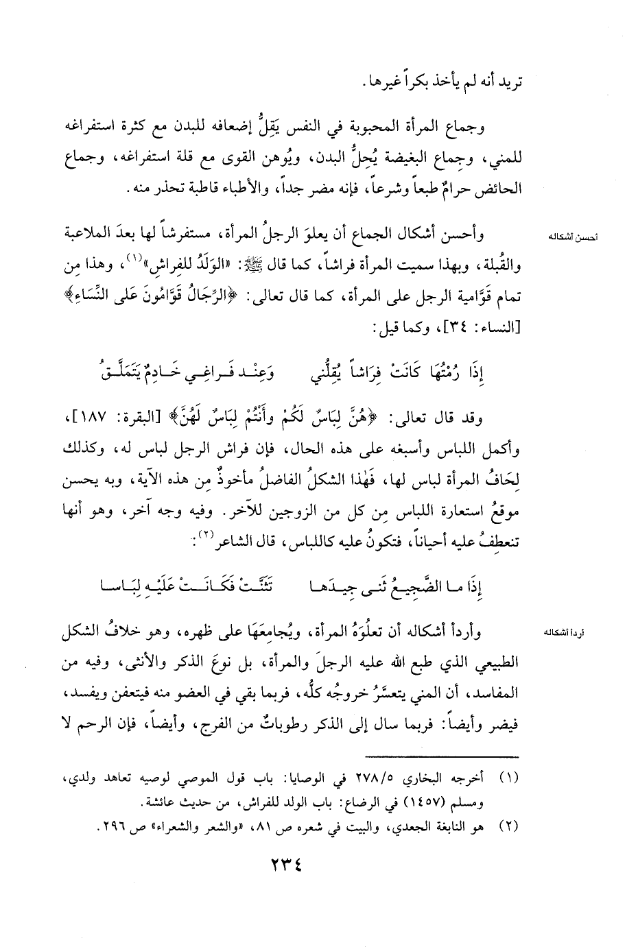 وَقَدْ قَالَ تَعَالَى: {هُنَّ لِبَاسٌ لَكُمْ وَأَنْتُمْ لِبَاسٌ لَهُنَّ} [البقرة: 187] [الْبَقَرَةِ: 187] ، وَأَكْمَلُ اللِّبَاسِ وَأَسْبَغُهُ عَلَى هَذِهِ الْحَالِ، فَإِنَّ فِرَاشَ الرَّجُلِ لِبَاسٌ لَهُ، وَكَذَلِكَ لِحَافُ الْمَرْأَةِ لِبَاسٌ لَهَا، فَهَذَا الشَّكْلُ الْفَاضِلُ مَأْخُوذٌ مِنْ هَذِهِ الْآيَةِ، وَبِهِ يَحْسُنُ مَوْقِعُ اسْتِعَارَةِ اللِّبَاسِ مِنْ كُلٍّ مِنَ الزَّوْجَيْنِ لِلْآخَرِ. وَفِيهِ وَجْهٌ آخَرُ، وَهُوَ أَنَّهَا تَنْعَطِفُ عَلَيْهِ أَحْيَانًا، فَتَكُونُ عَلَيْهِ كَاللِّبَاسِ، قَالَ الشَّاعِرُ: