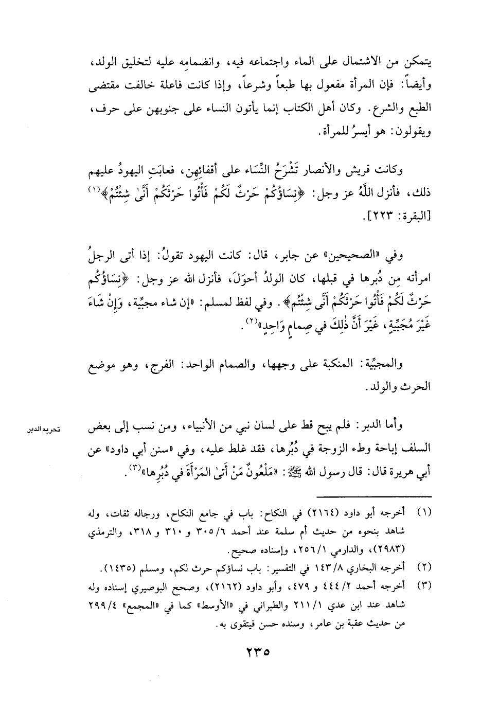 وَفِي " الصَّحِيحَيْنِ " عَنْ جابر، قَالَ: ( «كَانَتِ الْيَهُودُ تَقُولُ: إِذَا أَتَى الرَّجُلُ امْرَأَتَهُ مِنْ دُبُرِهَا فِي قُبُلِهَا، كَانَ الْوَلَدُ أَحْوَلَ» ) ، فَأَنْزَلَ اللَّهُ عَزَّ وَجَلَّ: {نِسَاؤُكُمْ حَرْثٌ لَكُمْ فَأْتُوا حَرْثَكُمْ أَنَّى شِئْتُمْ} [البقرة: 223] ، وَفِي لَفْظٍ لمسلم: ( «إِنْ شَاءَ مُجَبِّيَةً، وَإِنْ شَاءَ غَيْرَ مُجَبِّيَةٍ، غَيْرَ أَنَّ ذَلِكَ فِي صِمَامٍ وَاحِدٍ» ) .