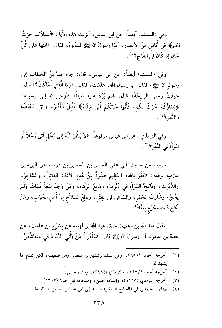 وَفِي الترمذي عَنِ ابْنِ عَبَّاسٍ مَرْفُوعًا: ( «لَا يَنْظُرُ اللَّهُ إِلَى رَجُلٍ أَتَى رَجُلًا أَوِ امْرَأَةً فِي الدُّبُرِ» ) .