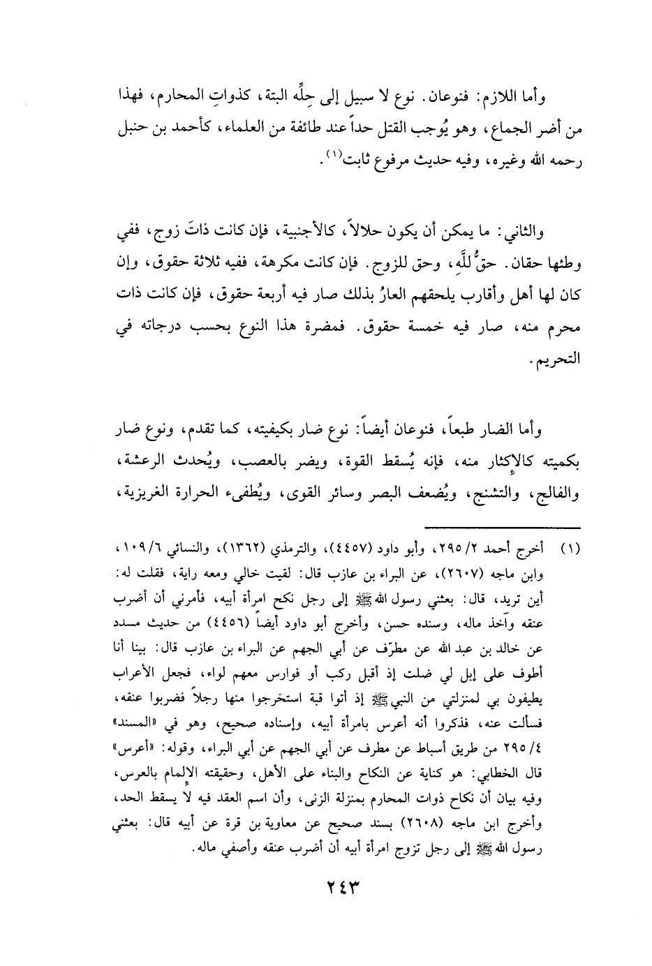 وَأَمَّا اللَّازِمُ: فَنَوْعَانِ. نَوْعٌ لَا سَبِيلَ إِلَى حِلِّهِ الْبَتَّةَ، كَذَوَاتِ الْمَحَارِمِ، فَهَذَا مِنْ أَضَرِّ الْجِمَاعِ، وَهُوَ يُوجِبُ الْقَتْلَ حَدًّا عِنْدَ طَائِفَةٍ مِنَ الْعُلَمَاءِ، كَأَحْمَدَ بْنِ حَنْبَلٍ رَحِمَهُ اللَّهُ وَغَيْرِهِ، وَفِيهِ حَدِيثٌ مَرْفُوعٌ ثَابِتٌ.