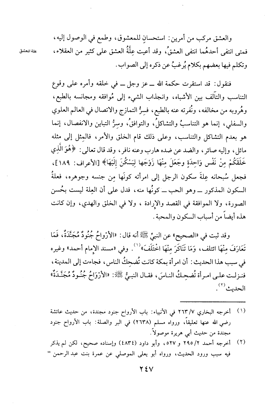 فَنَقُولُ: قَدِ اسْتَقَرَّتْ حِكْمَةُ اللَّهِ - عَزَّ وَجَلَّ - فِي خَلْقِهِ وَأَمْرِهِ عَلَى وُقُوعِ التَّنَاسُبِ وَالتَّآلُفِ بَيْنَ الْأَشْبَاهِ، وَانْجِذَابِ الشَّيْءِ إِلَى مُوَافِقِهِ وَمُجَانِسِهِ بِالطَّبْعِ، وَهُرُوبِهِ مِنْ مُخَالِفِهِ، وَنُفْرَتِهِ عَنْهُ بِالطَّبْعِ، فَسِرُّ التَّمَازُجِ وَالِاتِّصَالِ فِي الْعَالَمِ الْعُلْوِيِّ وَالسُّفْلِيِّ، إِنَّمَا هُوَ التَّنَاسُبُ وَالتَّشَاكُلُ، وَالتَّوَافُقُ، وَسِرُّ التَّبَايُنِ وَالِانْفِصَالِ إِنَّمَا هُوَ بِعَدَمِ التَّشَاكُلِ وَالتَّنَاسُبِ، وَعَلَى ذَلِكَ قَامَ الْخَلْقُ وَالْأَمْرُ، فَالْمِثْلُ إِلَى مِثْلِهِ مَائِلٌ، وَإِلَيْهِ صَائِرٌ، وَالضِّدُّ عَنْ ضِدِّهِ هَارِبٌ وَعَنْهُ نَافِرٌ، وَقَدْ قَالَ تَعَالَى: {هُوَ الَّذِي خَلَقَكُمْ مِنْ نَفْسٍ وَاحِدَةٍ وَجَعَلَ مِنْهَا زَوْجَهَا لِيَسْكُنَ إِلَيْهَا} [الأعراف: 189] [الْأَعْرَافِ: 189] ، فَجَعَلَ سُبْحَانَهُ عِلَّةَ سُكُونِ الرَّجُلِ إِلَى امْرَأَتِهِ كَوْنَهَا مِنْ جِنْسِهِ وَجَوْهَرِهِ، فَعِلَّةُ السُّكُونِ الْمَذْكُورِ - وَهُوَ الْحُبُّ - كَوْنُهَا مِنْهُ، فَدَلَّ عَلَى أَنَّ الْعِلَّةَ لَيْسَتْ بِحُسْنِ الصُّورَةِ، وَلَا الْمُوَافَقَةِ فِي الْقَصْدِ وَالْإِرَادَةِ، وَلَا فِي الْخُلُقِ وَالْهَدْيِ، وَإِنْ كَانَتْ هَذِهِ أَيْضًا مِنْ أَسْبَابِ السُّكُونِ وَالْمَحَبَّةِ.