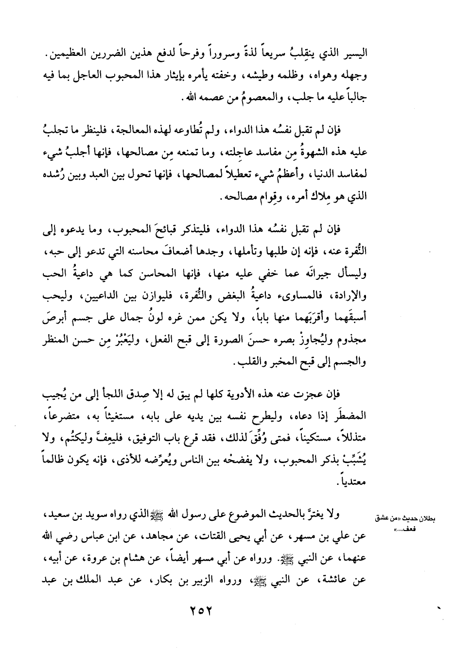 فَإِنْ لَمْ تَقْبَلْ نَفْسُهُ هَذَا الدَّوَاءَ، فَلْيَتَذَكَّرْ قَبَائِحَ الْمَحْبُوبِ، وَمَا يَدْعُوهُ إِلَى النُّفْرَةِ عَنْهُ، فَإِنَّهُ إِنْ طَلَبَهَا وَتَأَمَّلَهَا، وَجَدَهَا أَضْعَافَ مَحَاسِنِهِ الَّتِي تَدْعُو إِلَى حُبِّهِ، وَلْيَسْأَلْ جِيرَانَهُ عَمَّا خَفِيَ عَلَيْهِ مِنْهَا، فَإِنَّهَا الْمَحَاسِنُ، كَمَا هِيَ دَاعِيَةُ الْحُبِّ وَالْإِرَادَةِ، فَالْمَسَاوِئُ دَاعِيَةُ الْبُغْضِ وَالنُّفْرَةِ، فَلْيُوَازِنْ بَيْنَ الدَّاعِيَيْنِ، وَلْيُحِبَّ أَسْبَقَهُمَا وَأَقْرَبَهُمَا مِنْهَا بَابًا، وَلَا يَكُنْ مِمَّنْ غَرَّهُ لَوْنُ جَمَالٍ عَلَى جِسْمٍ أَبْرَصَ مَجْذُومٍ، وَلْيُجَاوِزْ بَصَرُهُ حُسْنَ الصُّورَةِ إِلَى قُبْحِ الْفِعْلِ، وَلْيَعْبُرْ مِنْ حُسْنِ الْمَنْظَرِ وَالْجِسْمِ إِلَى قُبْحِ الْمَخْبَرِ وَالْقَلْبِ.