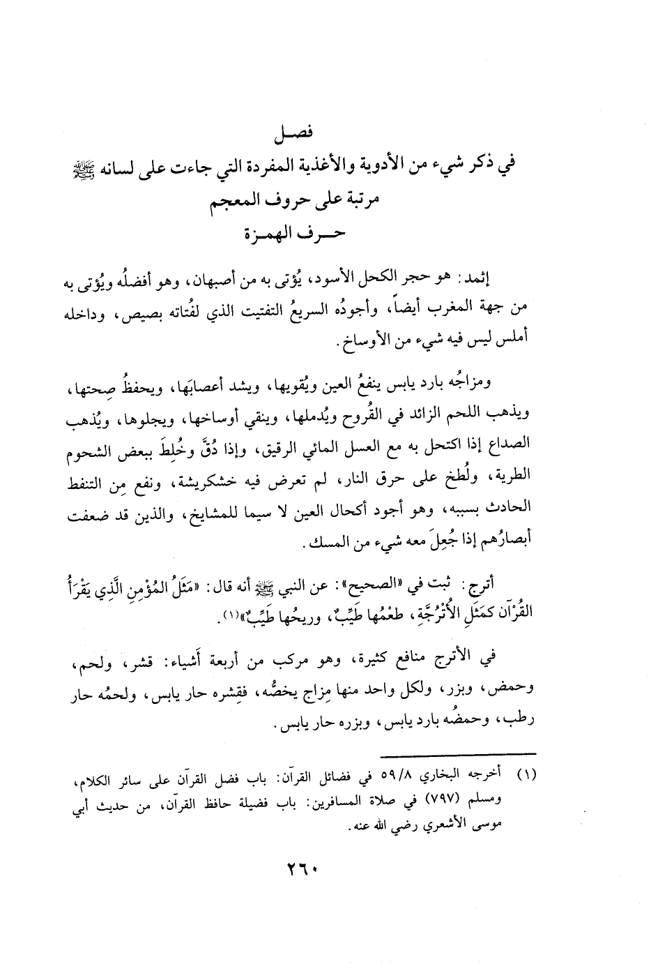 فِي ذِكْرِ شَيْءٍ مِنَ الْأَدْوِيَةِ وَالْأَغْذِيَةِ الْمُفْرَدَةِ الَّتِي جَاءَتْ عَلَى لِسَانِهِ صَلَّى اللَّهُ عَلَيْهِ وَسَلَّمَ مُرَتَّبَةً عَلَى حُرُوفِ الْمُعْجَمِ حَرْفُ الْهَمْزَةِ