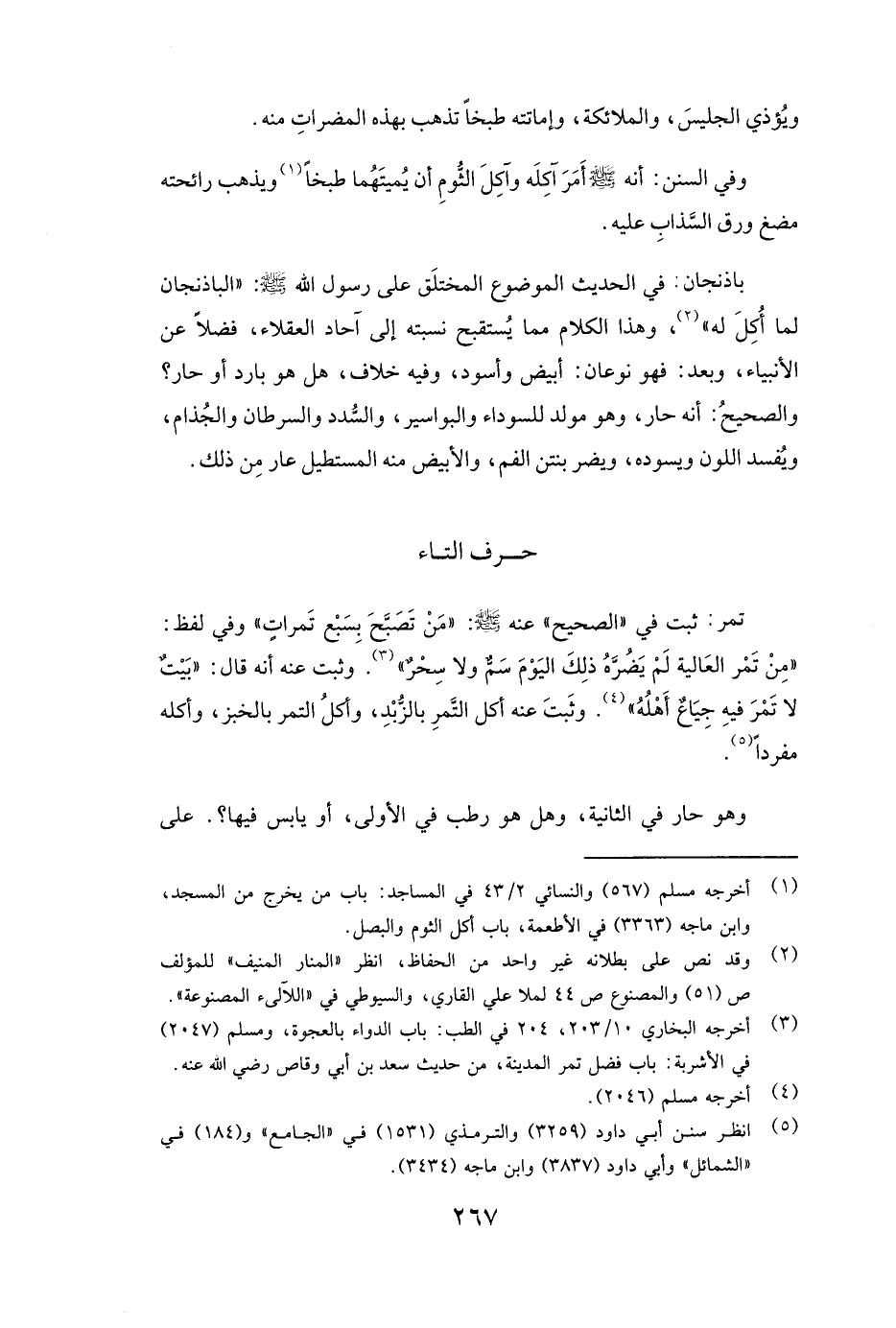 تَمْرٌ: ثَبَتَ فِي " الصَّحِيحِ " عَنْهُ صَلَّى اللَّهُ عَلَيْهِ وَسَلَّمَ: ( «مَنْ تَصَبَّحَ بِسَبْعِ تَمَرَاتٍ وَفِي لَفْظٍ: مِنْ تَمْرِ الْعَالِيَةِ لَمْ يَضُرَّهُ ذَلِكَ الْيَوْمَ سُمٌّ وَلَا سِحْرٌ» ) وَثَبَتَ عَنْهُ أَنَّهُ قَالَ: ( «بَيْتٌ لَا تَمْرَ فِيهِ جِيَاعٌ أَهْلُهُ» ) . وَثَبَتَ عَنْهُ أَكْلُ التَّمْرِ بِالزُّبْدِ، وَأَكْلُ التَّمْرِ بِالْخُبْزِ، وَأَكْلُهُ مُفْرَدًا.