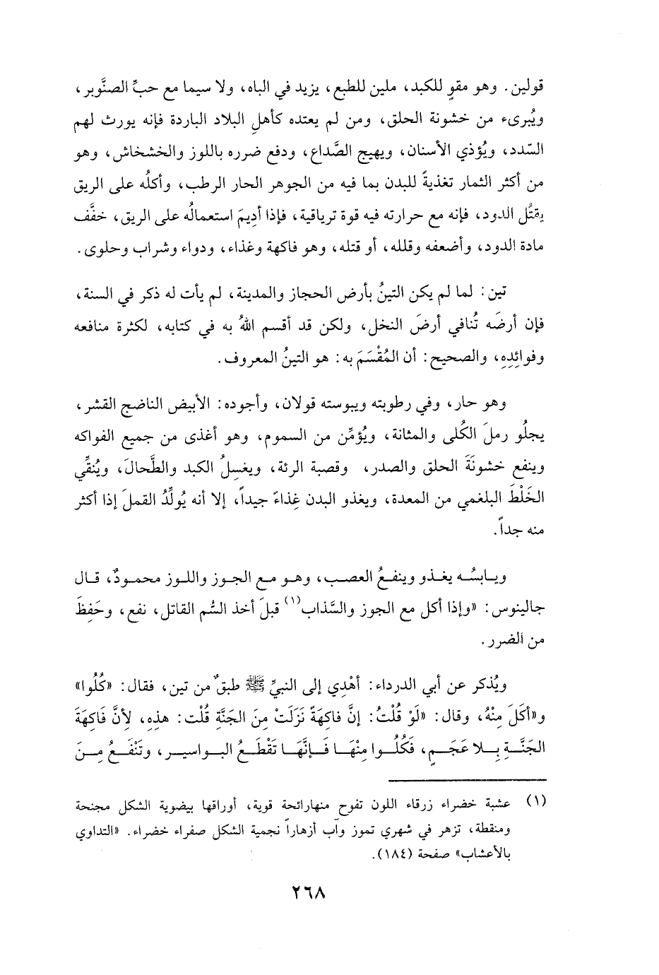 ٌ: لَمَّا لَمْ يَكُنِ التِّينُ بِأَرْضِ الْحِجَازِ وَالْمَدِينَةِ، لَمْ يَأْتِ لَهُ ذِكْرٌ فِي السُّنَّةِ، فَإِنَّ أَرْضَهُ تُنَافِي أَرْضَ النَّخْلِ، وَلَكِنْ قَدْ أَقْسَمَ اللَّهُ بِهِ فِي كِتَابِهِ لِكَثْرَةِ مَنَافِعِهِ وَفَوَائِدِهِ، وَالصَّحِيحُ أَنَّ الْمُقْسَمَ بِهِ: هُوَ التِّينُ الْمَعْرُوفُ.