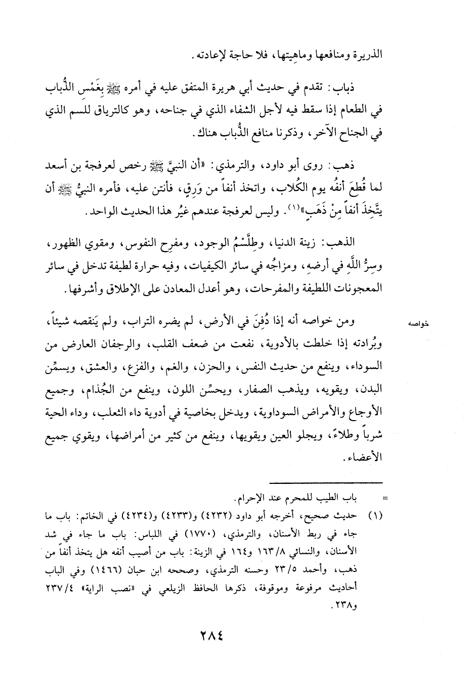 الذَّهَبُ: زِينَةُ الدُّنْيَا، وَطِلَّسْمُ الْوُجُودِ، وَمُفْرِحُ النُّفُوسِ، وَمُقَوِّي الظُّهُورِ، وَسِرُّ اللَّهِ فِي أَرْضِهِ، وَمِزَاجُهُ فِي سَائِرِ الْكَيْفِيَّاتِ، وَفِيهِ حَرَارَةٌ لَطِيفَةٌ تَدْخُلُ فِي سَائِرِ الْمَعْجُونَاتِ اللَّطِيفَةِ وَالْمُفْرِحَاتِ، وَهُوَ أَعْدَلُ الْمَعَادِنِ عَلَى الْإِطْلَاقِ وَأَشْرَفُهَا.