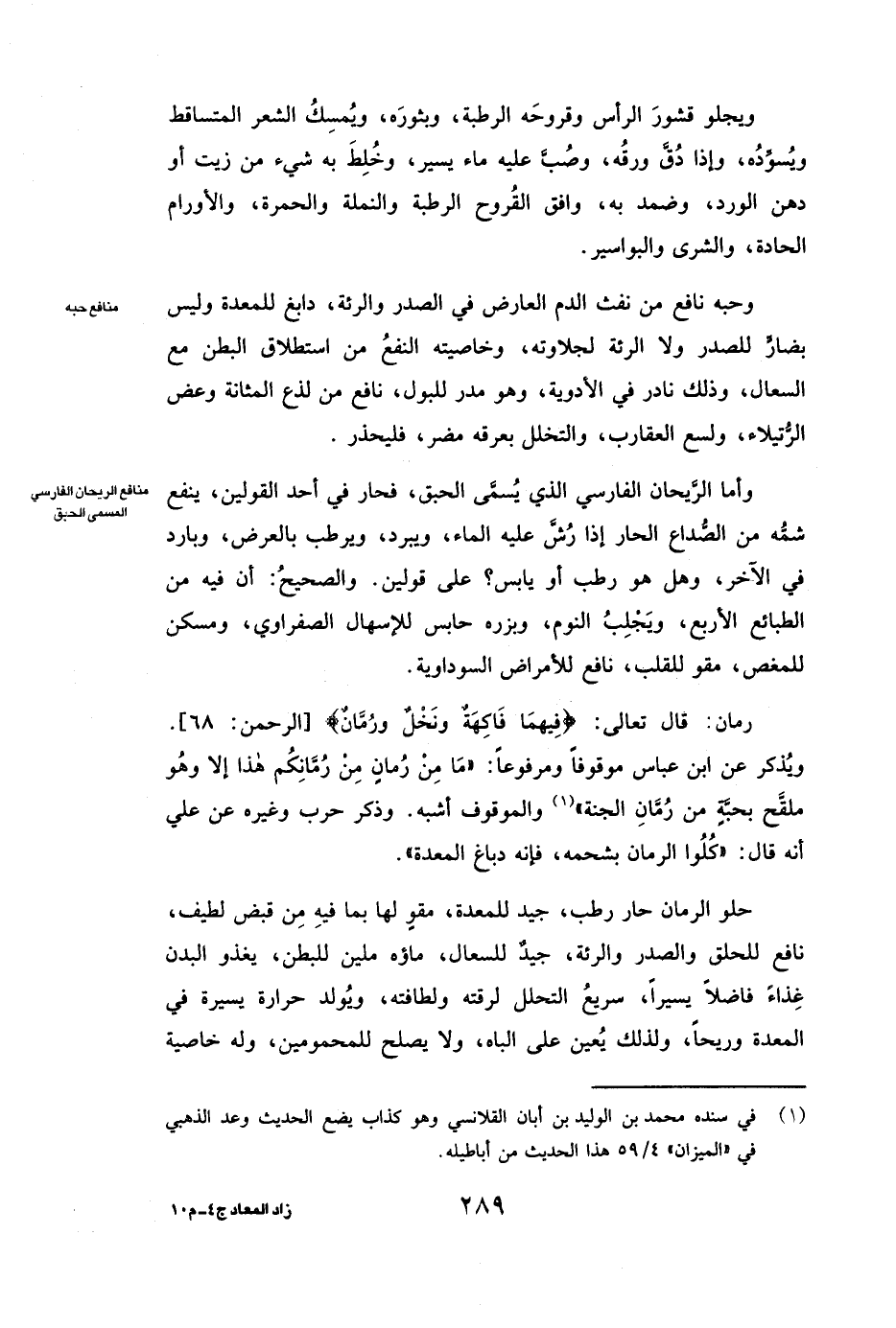 ٌ: قَالَ تَعَالَى: {فِيهِمَا فَاكِهَةٌ وَنَخْلٌ وَرُمَّانٌ} [الرحمن: 68] [الرَّحْمَنِ: 68] . وَيُذْكَرُ عَنِ ابْنِ عَبَّاسٍ مَوْقُوفًا وَمَرْفُوعًا: ( «مَا مِنْ رُمَّانٍ مِنْ رُمَّانِكُمْ هَذَا إِلَّا وَهُوَ مُلَقَّحٌ بِحَبَّةٍ مِنْ رُمَّانِ الْجَنَّةِ» وَالْمَوْقُوفُ أَشْبَهُ. وَذَكَرَ حرب وَغَيْرُهُ عَنْ علي أَنَّهُ قَالَ: (كُلُوا الرُّمَّانَ بِشَحْمِهِ، فَإِنَّهُ دِبَاغُ الْمَعِدَةِ.