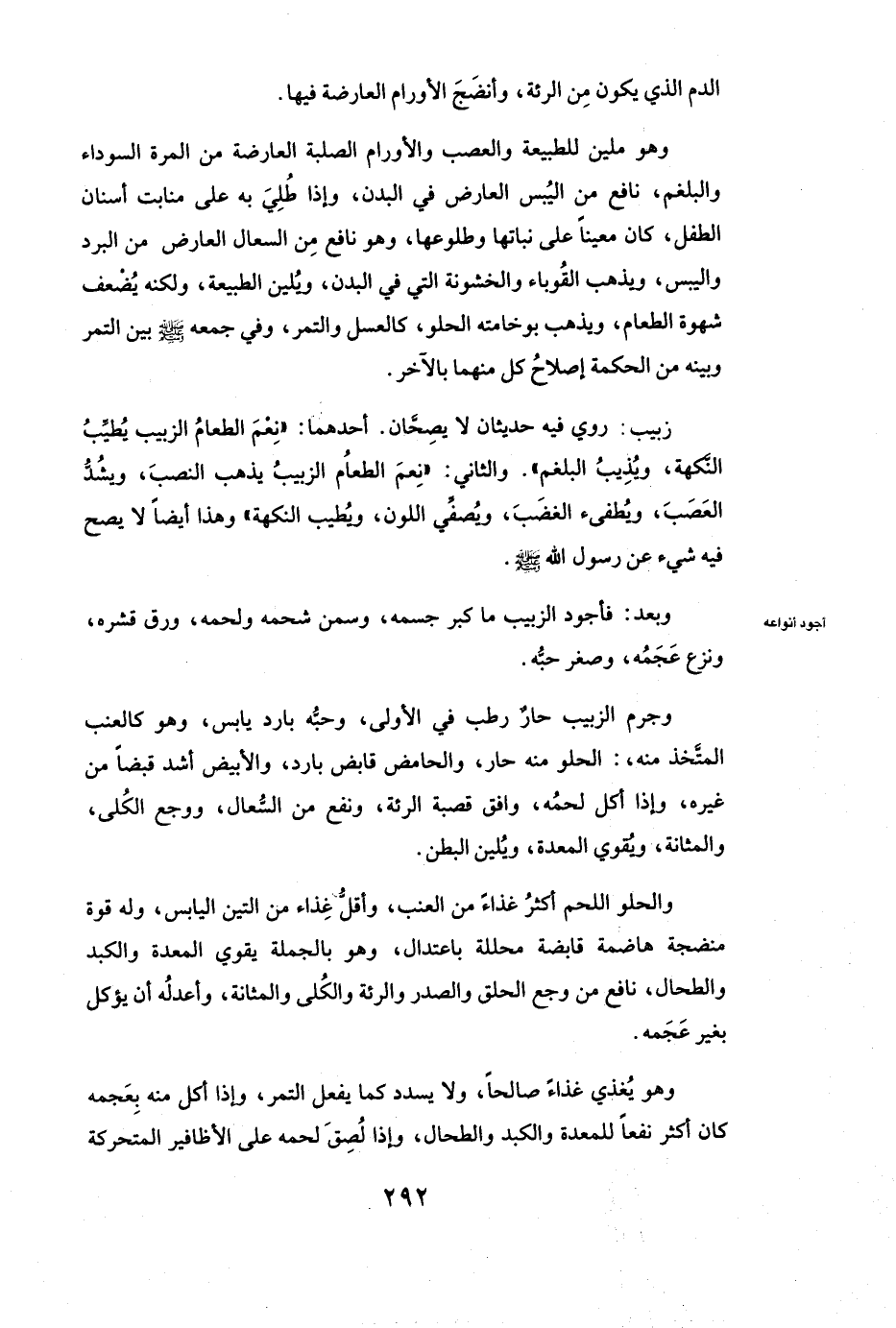 ٌ: رُوِيَ فِيهِ حَدِيثَانِ لَا يَصِحَّانِ. أَحَدُهُمَا: ( «نِعْمَ الطَّعَامُ الزَّبِيبُ يُطَيِّبُ النَّكْهَةَ، وَيُذِيبُ الْبَلْغَمَ» ) . وَالثَّانِي: ( «نِعْمَ الطَّعَامُ الزَّبِيبُ يُذْهِبُ النَّصَبَ، وَيَشُدُّ الْعَصَبَ، وَيُطْفِئُ الْغَضَبَ، وَيُصَفِّي اللَّوْنَ، وَيُطَيِّبُ النَّكْهَةَ» ) وَهَذَا أَيْضًا لَا يَصِحُّ فِيهِ شَيْءٌ عَنْ رَسُولِ اللَّهِ.