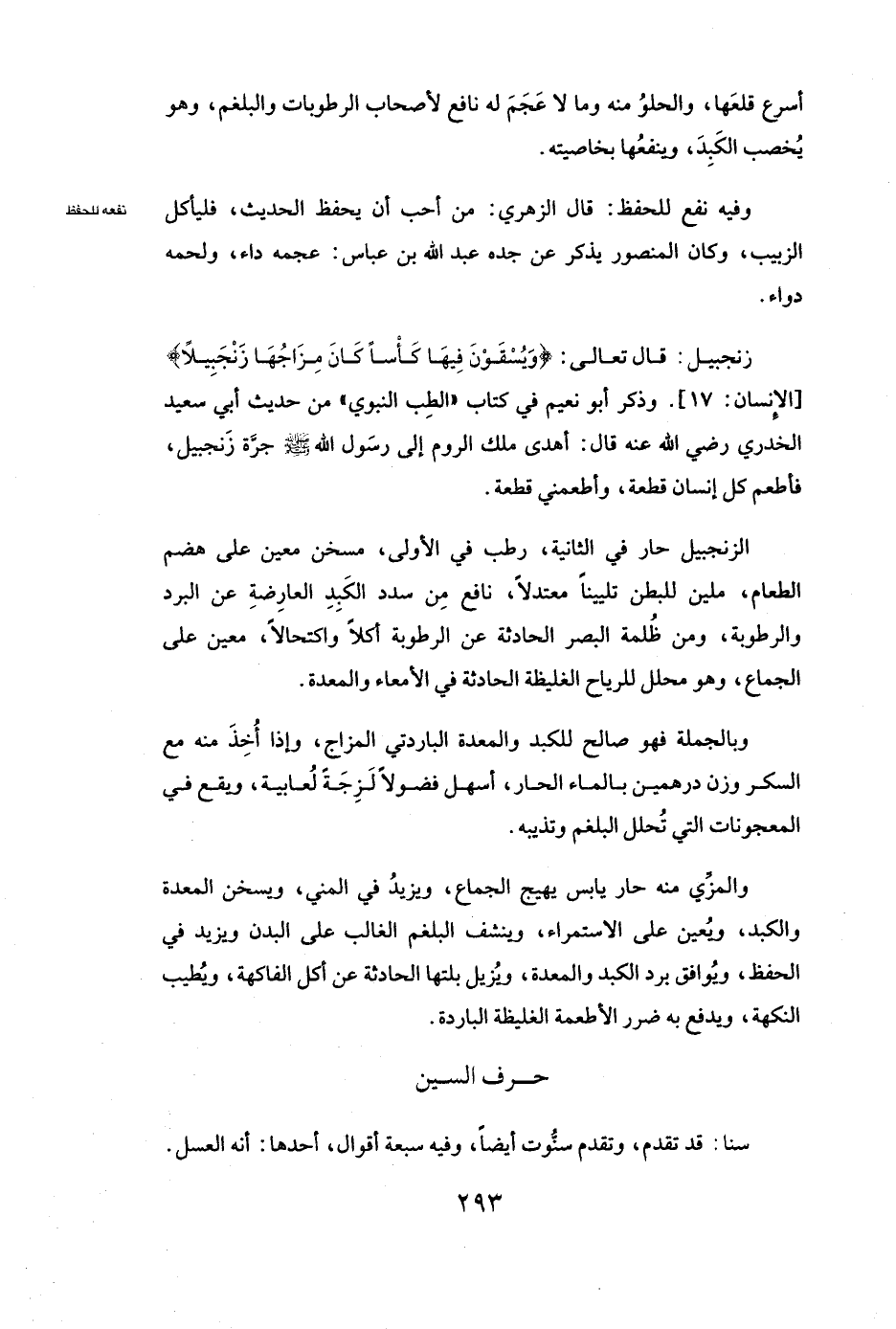ٌ: قَالَ تَعَالَى: {وَيُسْقَوْنَ فِيهَا كَأْسًا كَانَ مِزَاجُهَا زَنْجَبِيلًا} [الإنسان: 17] [الْإِنْسَانِ: 17] . وَذَكَرَ أبو نعيم فِي كِتَابِ " الطِّبِّ النَّبَوِيِّ " مِنْ حَدِيثِ أَبِي سَعِيدٍ الْخُدْرِيِّ رَضِيَ اللَّهُ عَنْهُ قَالَ: ( «أَهْدَى مَلِكُ الرُّومِ إِلَى رَسُولِ اللَّهِ صَلَّى اللَّهُ عَلَيْهِ وَسَلَّمَ جَرَّةَ زَنْجَبِيلٍ، فَأَطْعَمَ كُلَّ إِنْسَانٍ قِطْعَةً، وَأَطْعَمَنِي قِطْعَةً» ) .