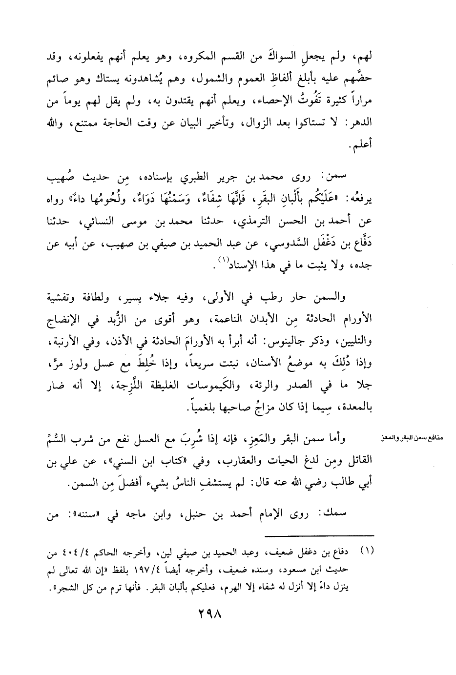 وَأَمَّا سَمْنُ الْبَقَرِ وَالْمَعِزِ، فَإِنَّهُ إِذَا شُرِبَ مَعَ الْعَسَلِ نَفَعَ مِنْ شُرْبِ السُّمِّ الْقَاتِلِ وَمِنْ لَدْغِ الْحَيَّاتِ وَالْعَقَارِبِ، وَفِي " كِتَابِ ابْنِ السُّنِّيِّ "، عَنْ عَلِيِّ بْنِ أَبِي طَالِبٍ رَضِيَ اللَّهُ عَنْهُ قَالَ: (لَمْ يَسْتَشْفِ النَّاسُ بِشَيْءٍ أَفْضَلَ مِنَ السَّمْنِ) .