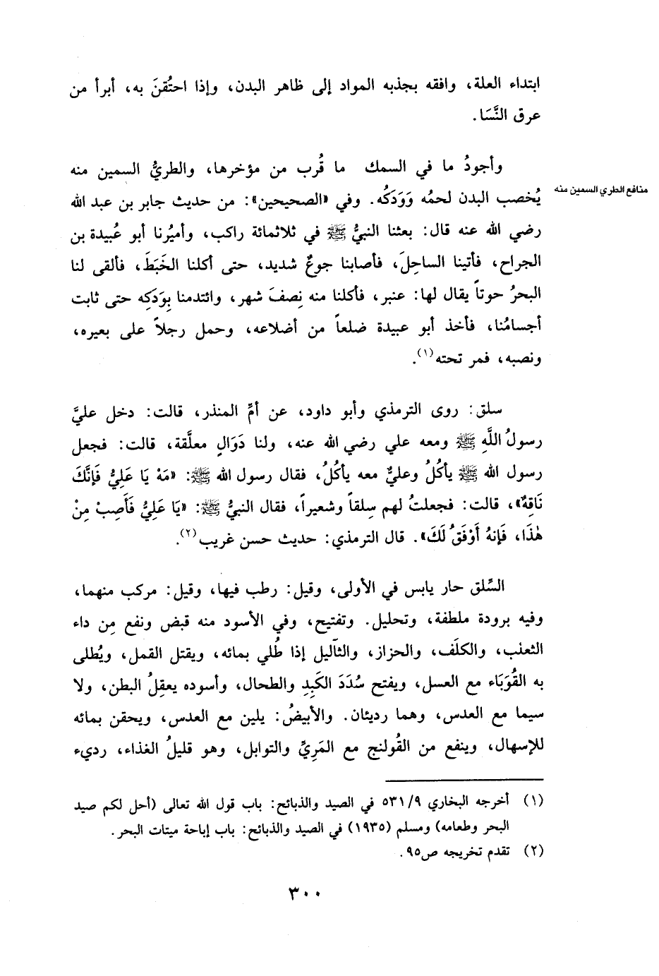 وَأَجْوَدُ مَا فِي السَّمَكِ مَا قَرُبَ مِنْ مُؤَخِّرِهَا، وَالطَّرِيُّ السَّمِينُ مِنْهُ يُخَصِّبُ الْبَدَنَ لَحْمُهُ وَوَدَكُهُ. وَفِي " الصَّحِيحَيْنِ ": مِنْ حَدِيثِ جَابِرِ بْنِ عَبْدِ اللَّهِ رَضِيَ اللَّهُ عَنْهُ قَالَ: «بَعَثَنَا النَّبِيُّ صَلَّى اللَّهُ عَلَيْهِ وَسَلَّمَ فِي ثَلَاثِمِائَةِ رَاكِبٍ، وَأَمِيرُنَا أَبُو عُبَيْدَةَ بْنُ الْجَرَّاحِ، فَأَتَيْنَا السَّاحِلَ، فَأَصَابَنَا جُوعٌ شَدِيدٌ، حَتَّى أَكَلْنَا الْخَبَطَ، فَأَلْقَى لَنَا الْبَحْرُ حُوتًا يُقَالُ لَهَا: عَنْبَرُ، فَأَكَلْنَا مِنْهُ نِصْفَ شَهْرٍ، وَائْتَدَمْنَا بِوَدَكِهِ حَتَّى ثَابَتْ أَجْسَامُنَا، فَأَخَذَ أبو عبيدة ضِلْعًا مِنْ أَضْلَاعِهِ، وَحَمَلَ رَجُلًا عَلَى بَعِيرِهِ، وَنَصَبَهُ، فَمَرَّ تَحْتَهُ» .