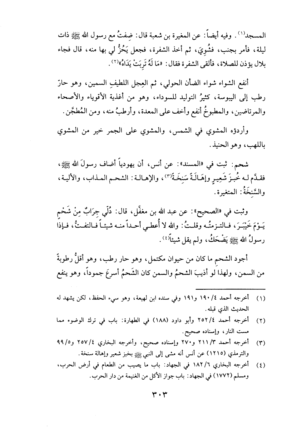 الْمَسْجِدِ» ) . وَفِيهِ أَيْضًا: عَنِ الْمُغِيرَةِ بْنِ شُعْبَةَ قَالَ: ( «ضِفْتُ مَعَ رَسُولِ اللَّهِ صَلَّى اللَّهُ عَلَيْهِ وَسَلَّمَ ذَاتَ لَيْلَةٍ، فَأَمَرَ بِجَنْبٍ، فَشُوِيَ، ثُمَّ أَخَذَ الشَّفْرَةَ، فَجَعَلَ يَحُزُّ لِي بِهَا مِنْهُ، قَالَ: فَجَاءَ بلال يُؤَذِّنُ لِلصَّلَاةِ، فَأَلْقَى الشَّفْرَةَ فَقَالَ: " مَا لَهُ تَرِبَتْ يَدَاهُ» ) .