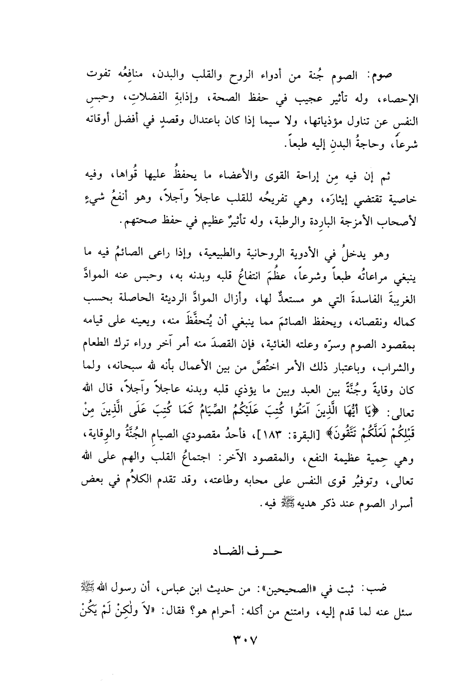 ٌ: الصَّوْمُ جُنَّةٌ مِنْ أَدْوَاءِ الرُّوحِ وَالْقَلْبِ وَالْبَدَنِ، مَنَافِعُهُ تَفُوتُ الْإِحْصَاءَ، وَلَهُ تَأْثِيرٌ عَجِيبٌ فِي حِفْظِ الصِّحَّةِ، وَإِذَابَةِ الْفَضَلَاتِ، وَحَبْسِ النَّفْسِ عَنْ تَنَاوُلِ مُؤْذِيَاتِهَا، وَلَا سِيَّمَا إِذَا كَانَ بِاعْتِدَالٍ وَقَصْدٍ فِي أَفْضَلِ أَوْقَاتِهِ شَرْعًا، وَحَاجَةُ الْبَدَنِ إِلَيْهِ طَبْعًا.
