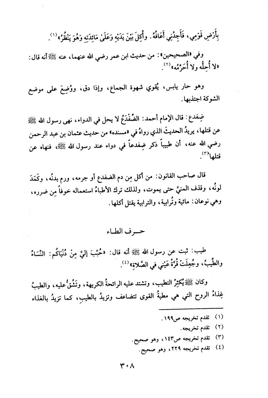 ٌ: قَالَ الْإِمَامُ أَحْمَدُ: الضِّفْدَعُ لَا يَحِلُّ فِي الدَّوَاءِ، نَهَى رَسُولُ اللَّهِ صَلَّى اللَّهُ عَلَيْهِ وَسَلَّمَ عَنْ قَتْلِهَا، يُرِيدُ الْحَدِيثَ الَّذِي رَوَاهُ فِي " مُسْنَدِهِ " مِنْ حَدِيثِ عثمان بن عبد الرحمن رَضِيَ اللَّهُ عَنْهُ، ( «أَنَّ طَبِيبًا ذَكَرَ ضِفْدَعًا فِي دَوَاءٍ عِنْدَ رَسُولِ اللَّهِ صَلَّى اللَّهُ عَلَيْهِ وَسَلَّمَ، فَنَهَاهُ عَنْ قَتْلِهَا» ) .
