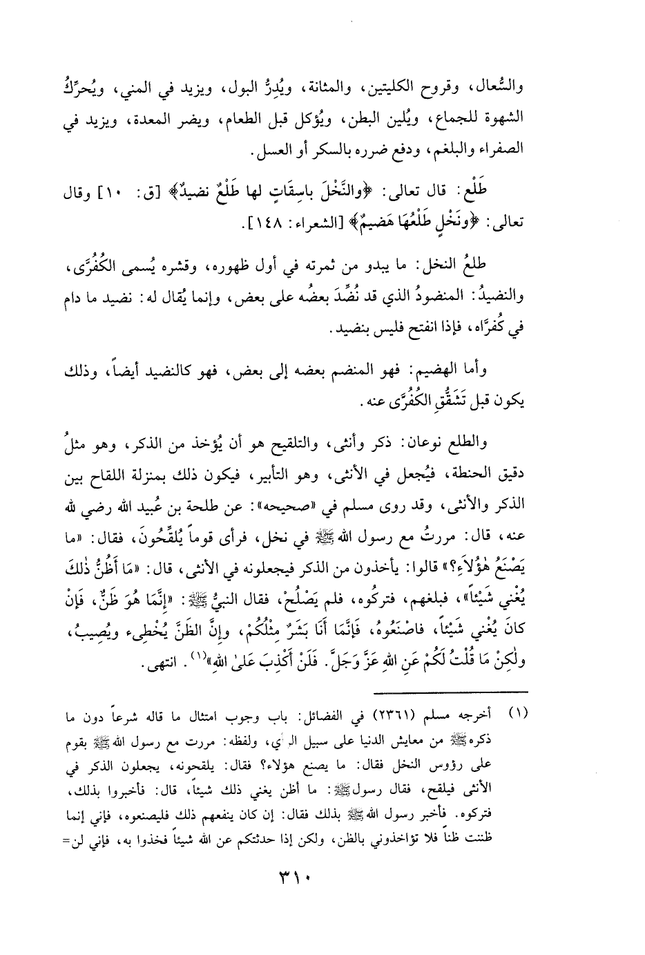 وَالطَّلْعُ نَوْعَانِ: ذَكَرٌ وَأُنْثَى، وَالتَّلْقِيحُ هُوَ أَنْ يُؤْخَذَ مِنَ الذَّكَرِ، وَهُوَ مِثْلُ دَقِيقِ الْحِنْطَةِ، فَيُجْعَلَ فِي الْأُنْثَى، وَهُوَ التَّأْبِيرُ، فَيَكُونُ ذَلِكَ بِمَنْزِلَةِ اللِّقَاحِ بَيْنَ الذَّكَرِ وَالْأُنْثَى، وَقَدْ رَوَى مسلم فِي " صَحِيحِهِ ": عَنْ طَلْحَةَ بْنِ عُبَيْدِ اللَّهِ رَضِيَ اللَّهُ عَنْهُ، قَالَ: «مَرَرْتُ مَعَ رَسُولِ اللَّهِ صَلَّى اللَّهُ عَلَيْهِ وَسَلَّمَ فِي نَخْلٍ، فَرَأَى قَوْمًا يُلَقِّحُونَ، فَقَالَ: (مَا يَصْنَعُ هَؤُلَاءِ؟ " قَالُوا: يَأْخُذُونَ مِنَ الذَّكَرِ فَيَجْعَلُونَهُ فِي الْأُنْثَى، قَالَ: " مَا أَظُنُّ ذَلِكَ يُغْنِي شَيْئًا "، فَبَلَغَهُمْ، فَتَرَكُوهُ، فَلَمْ يَصْلُحْ، فَقَالَ النَّبِيُّ صَلَّى اللَّهُ عَلَيْهِ وَسَلَّمَ: " إِنَّمَا هُوَ ظَنٌّ، فَإِنْ كَانَ يُغْنِي شَيْئًا، فَاصْنَعُوهُ، فَإِنَّمَا أَنَا بَشَرٌ مِثْلُكُمْ، وَإِنَّ الظَّنَّ يُخْطِئُ وَيُصِيبُ، وَلَكِنْ مَا قُلْتُ لَكُمْ عَنِ اللَّهِ عَزَّ وَجَلَّ. فَلَنْ أَكْذِبَ عَلَى اللَّهِ» ) انْتَهَى.