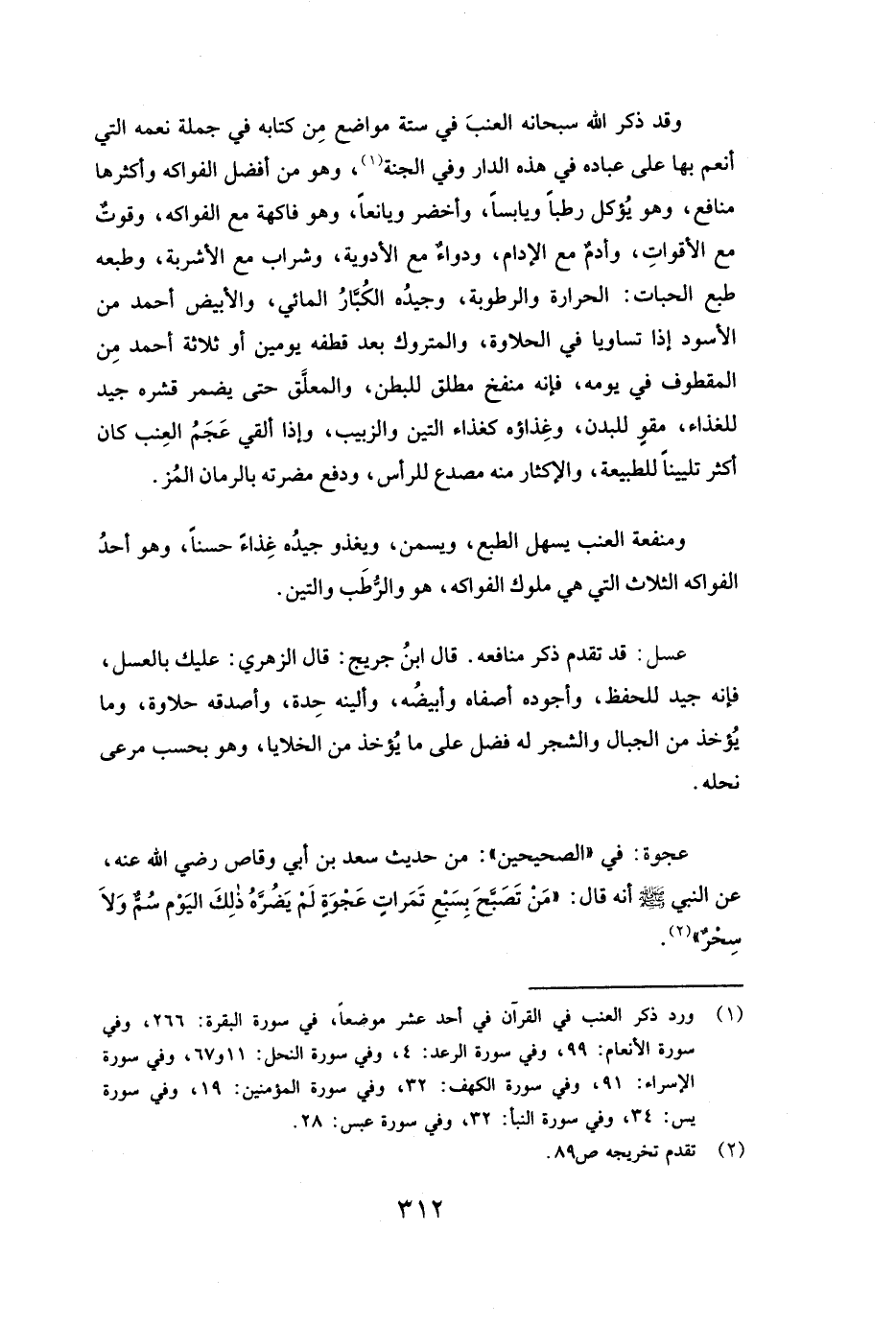 وَقَدْ ذَكَرَ اللَّهُ سُبْحَانَهُ الْعِنَبَ فِي سِتَّةِ مَوَاضِعَ مِنْ كِتَابِهِ فِي جُمْلَةِ نِعَمِهِ الَّتِي أَنْعَمَ بِهَا عَلَى عِبَادِهِ فِي هَذِهِ الدَّارِ وَفِي الْجَنَّةِ، وَهُوَ مِنْ أَفْضَلِ الْفَوَاكِهِ وَأَكْثَرِهَا مَنَافِعَ، وَهُوَ يُؤْكَلُ رَطْبًا وَيَابِسًا، وَأَخْضَرَ وَيَانِعًا، وَهُوَ فَاكِهَةٌ مَعَ الْفَوَاكِهِ، وَقُوتٌ مَعَ الْأَقْوَاتِ، وَأُدْمٌ مَعَ الْإِدَامِ، وَدَوَاءٌ مَعَ الْأَدْوِيَةِ، وَشَرَابٌ مَعَ الْأَشْرِبَةِ، وَطَبْعُهُ طَبْعُ الْحَبَّاتِ: الْحَرَارَةُ وَالرُّطُوبَةُ، وَجَيِّدُهُ الْكُبَّارُ الْمَائِيُّ، وَالْأَبْيَضُ أَحْمَدُ مِنَ الْأَسْوَدِ إِذَا تَسَاوَيَا فِي الْحَلَاوَةِ، وَالْمَتْرُوكُ بَعْدَ قَطْفِهِ يَوْمَيْنِ أَوْ ثَلَاثَةً أَحْمَدُ مِنَ الْمَقْطُوفِ فِي يَوْمِهِ، فَإِنَّهُ مُنْفِخٌ مُطْلِقٌ لِلْبَطْنِ، وَالْمُعَلَّقُ حَتَّى يَضْمُرَ قِشْرُهُ جَيِّدٌ لِلْغِذَاءِ، مُقَوٍّ لِلْبَدَنِ، وَغِذَاؤُهُ كَغِذَاءِ التِّينِ وَالزَّبِيبِ، وَإِذَا أُلْقِيَ عَجَمُ الْعِنَبِ كَانَ أَكْثَرَ تَلْيِينًا لِلطَّبِيعَةِ، وَالْإِكْثَارُ مِنْهُ مُصَدِّعٌ لِلرَّأْسِ، وَدَفْعُ مَضَرَّتِهِ بِالرُّمَّانِ الْمُزِّ.