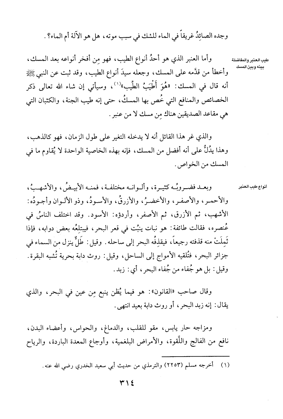 وَأَمَّا الْعَنْبَرُ الَّذِي هُوَ أَحَدُ أَنْوَاعِ الطِّيبِ، فَهُوَ مِنْ أَفْخَرِ أَنْوَاعِهِ بَعْدَ الْمِسْكِ، وَأَخْطَأَ مَنْ قَدَّمَهُ عَلَى الْمِسْكِ، وَجَعَلَهُ سَيِّدَ أَنْوَاعِ الطِّيبِ، وَقَدْ ثَبَتَ عَنِ النَّبِيِّ صَلَّى اللَّهُ عَلَيْهِ وَسَلَّمَ أَنَّهُ قَالَ فِي الْمِسْكِ: ( «هُوَ أَطْيَبُ الطِّيبِ» ) ، وَسَيَأْتِي إِنْ شَاءَ اللَّهُ تَعَالَى ذِكْرُ الْخَصَائِصِ وَالْمَنَافِعِ الَّتِي خُصَّ بِهَا الْمِسْكُ، حَتَّى إِنَّهُ طِيبُ الْجَنَّةِ وَالْكُثْبَانُ الَّتِي هِيَ مَقَاعِدُ الصِّدِّيقِينَ هُنَاكَ مِنْ مِسْكٍ لَا مِنْ عَنْبَرٍ.