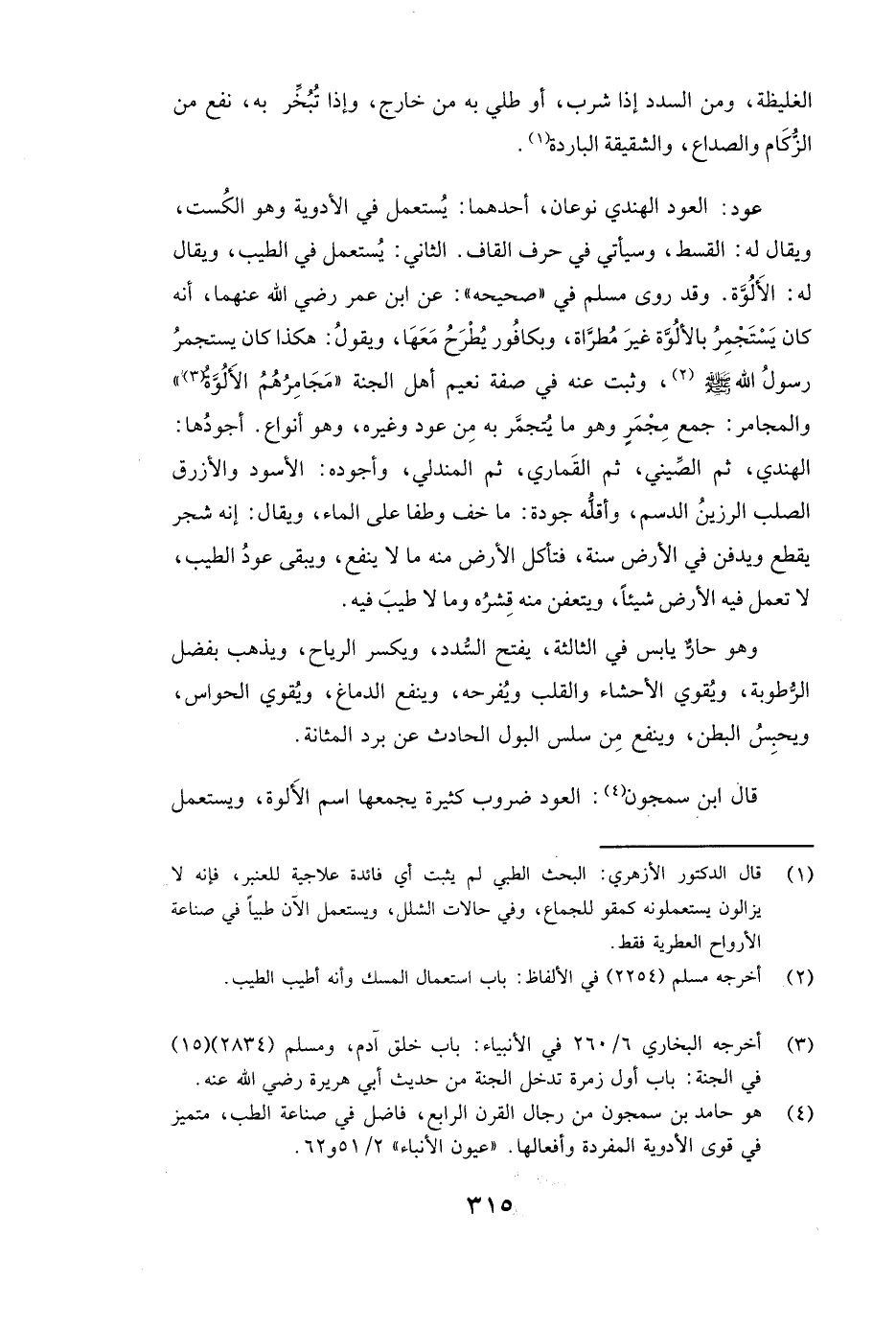 ٌ: الْعُودُ الْهِنْدِيُّ نَوْعَانِ، أَحَدُهُمَا: يُسْتَعْمَلُ فِي الْأَدْوِيَةِ وَهُوَ الْكُسْتُ، وَيُقَالُ لَهُ: الْقُسْطُ وَسَيَأْتِي فِي حَرْفِ الْقَافِ. الثَّانِي: يُسْتَعْمَلُ فِي الطِّيبِ، وَيُقَالُ لَهُ: الْأَلُوَّةُ. وَقَدْ رَوَى مسلم فِي " صَحِيحِهِ ": عَنِ ابْنِ عُمَرَ رَضِيَ اللَّهُ عَنْهُمَا، أَنَّهُ ( «كَانَ يَسْتَجْمِرُ بِالْأَلُوَّةِ غَيْرَ مُطَرَّاةٍ، وَبِكَافُورٍ يُطْرَحُ مَعَهَا، وَيَقُولُ: هَكَذَا كَانَ يَسْتَجْمِرُ رَسُولُ اللَّهِ صَلَّى اللَّهُ عَلَيْهِ وَسَلَّمَ،» ) وَثَبَتَ عَنْهُ فِي صِفَةِ نَعِيمِ أَهْلِ الْجَنَّةِ ( «مَجَامِرُهُمُ الْأَلُوَّةُ» ) وَالْمَجَامِرُ: جَمْعُ مِجْمَرٍ وَهُوَ مَا يُتَجَمَّرُ بِهِ مِنْ عُودٍ وَغَيْرِهِ، وَهُوَ أَنْوَاعٌ. أَجْوَدُهَا: الْهِنْدِيُّ، ثُمَّ الصِّينِيُّ، ثُمَّ الْقَمَارِيُّ، ثُمَّ الْمَنْدَلِيُّ، وَأَجْوَدُهُ: الْأَسْوَدُ وَالْأَزْرَقُ الصُّلْبُ الرَّزِينُ الدَّسِمُ، وَأَقَلُّهُ جَوْدَةً مَا خَفَّ وَطَفَا عَلَى الْمَاءِ، وَيُقَالُ: إِنَّهُ شَجَرٌ يُقْطَعُ وَيُدْفَنُ فِي الْأَرْضِ سَنَةً، فَتَأْكُلُ الْأَرْضُ مِنْهُ مَا لَا يَنْفَعُ، وَيَبْقَى عُودُ الطِّيبِ، لَا تَعْمَلُ فِيهِ الْأَرْضُ شَيْئًا، يَتَعَفَّنُ مِنْهُ قِشْرُهُ وَمَا لَا طِيبَ فِيهِ.