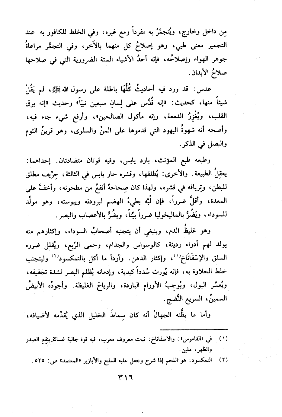 وَهُوَ غَلِيظُ الدَّمِ، وَيَنْبَغِي أَنْ يَتَجَنَّبَهُ أَصْحَابُ السَّوْدَاءِ، وَإِكْثَارُهُمْ مِنْهُ يُوَلِّدُ لَهُمْ أَدْوَاءً رَدِيئَةً، كَالْوَسْوَاسِ وَالْجُذَامِ، وَحُمَّى الرِّبْعِ، وَيُقَلِّلُ ضَرَرَهُ السِّلْقُ وَالْإِسْفَانَاخُ، وَإِكْثَارُ الدُّهْنِ. وَأَرْدَأَ مَا أُكِلَ بِالنَّمْكَسُودِ وَلْيُتَجَنَّبْ خَلْطُ الْحَلَاوَةِ بِهِ، فَإِنَّهُ يُورِثُ سُدَدًا كَبِدِيَّةً، وَإِدْمَانُهُ يُظْلِمُ الْبَصَرَ لِشِدَّةِ تَجْفِيفِهِ، وَيُعْسِرُ الْبَوْلَ، وَيُوجِبُ الْأَوْرَامَ الْبَارِدَةَ، وَالرِّيَاحَ الْغَلِيظَةَ. وَأَجْوَدُهُ الْأَبْيَضُ السَّمِينُ، السَّرِيعُ النُّضْجِ.