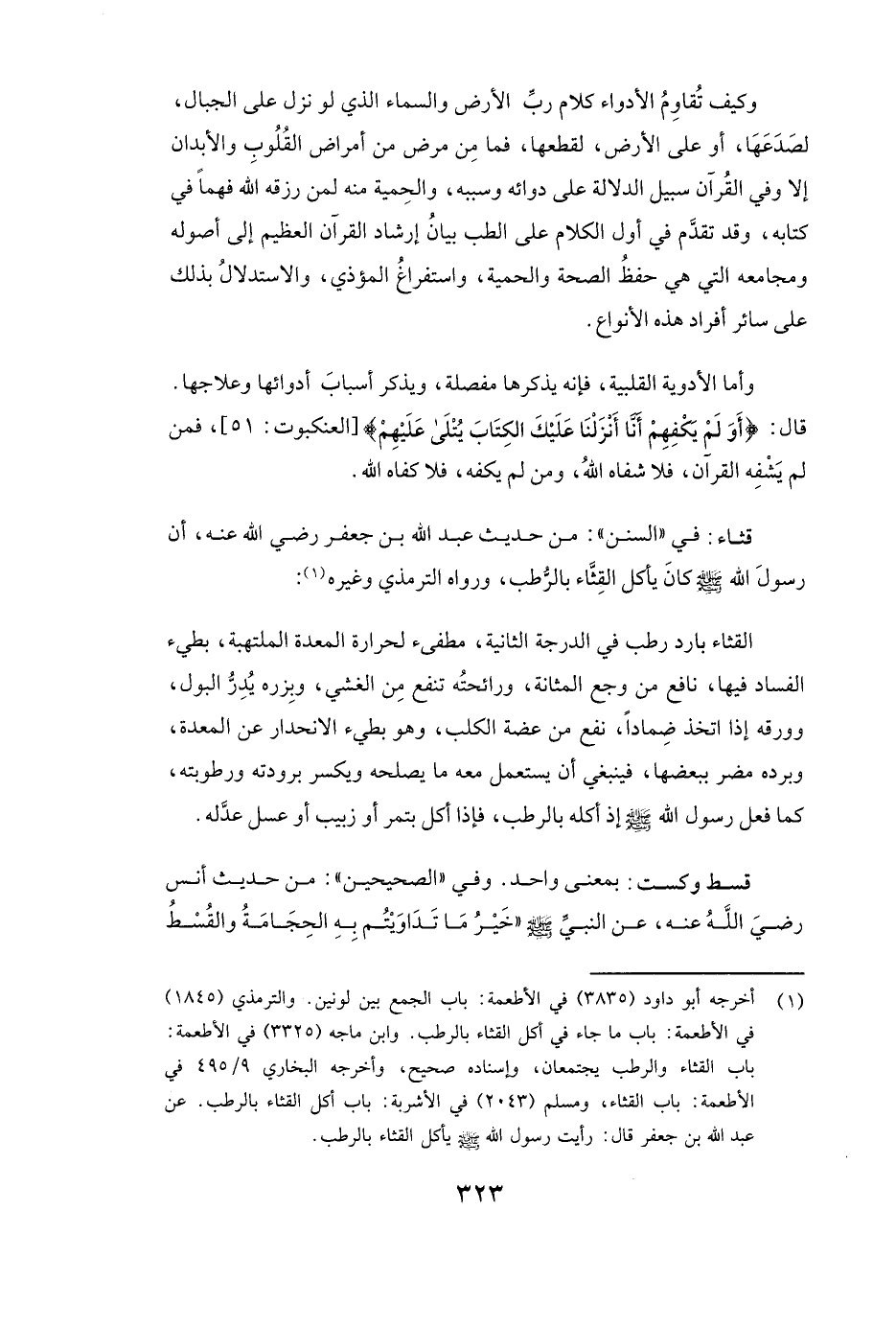 ٌ: فِي " السُّنَنِ ": مِنْ حَدِيثِ عبد الله بن جعفر رَضِيَ اللَّهُ عَنْهُ، أَنَّ رَسُولَ اللَّهِ صَلَّى اللَّهُ عَلَيْهِ وَسَلَّمَ ( «كَانَ يَأْكُلُ الْقِثَّاءَ بِالرُّطَبِ» ) ، وَرَوَاهُ الترمذي وَغَيْرُهُ.
