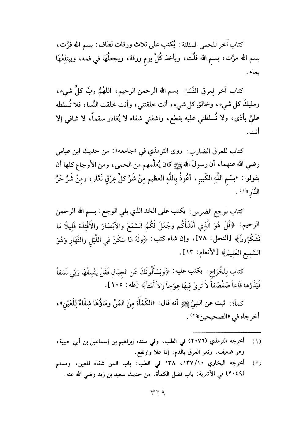 ِ: يُكْتَبُ عَلَى الْخَدِّ الَّذِي يَلِي الْوَجَعَ: بِسْمِ اللَّهِ الرَّحْمَنِ الرَّحِيمِ {قُلْ هُوَ الَّذِي أَنْشَأَكُمْ وَجَعَلَ لَكُمُ السَّمْعَ وَالْأَبْصَارَ وَالْأَفْئِدَةَ قَلِيلًا مَا تَشْكُرُونَ} [الملك: 23] [النَّحْلِ: 78] ، وَإِنْ شَاءَ كَتَبَ {وَلَهُ مَا سَكَنَ فِي اللَّيْلِ وَالنَّهَارِ وَهُوَ السَّمِيعُ الْعَلِيمُ} [الأنعام: 13] [الْأَنْعَامِ: 13] .