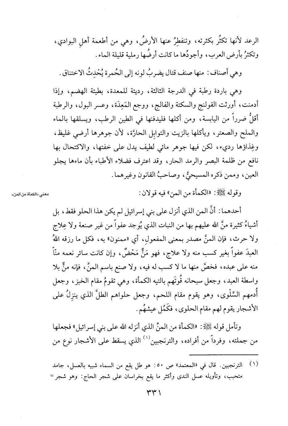 وَتَأَمَّلْ قَوْلَهُ صَلَّى اللَّهُ عَلَيْهِ وَسَلَّمَ: ( «الْكَمْأَةُ مِنَ الْمَنِّ الَّذِي أَنْزَلَهُ اللَّهُ عَلَى بَنِي إِسْرَائِيلَ» ) فَجَعَلَهَا مِنْ جُمْلَتِهِ وَفَرْدًا مِنْ أَفْرَادِهِ، وَالتَّرَنْجَبِينُ الَّذِي يَسْقُطُ عَلَى الْأَشْجَارِ نَوْعٌ مِنَ