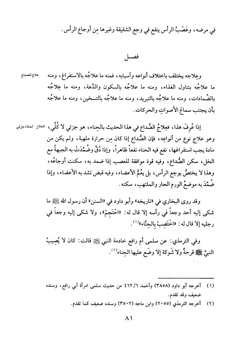 إِذَا عُرِفَ هَذَا، فَعِلَاجُ الصُّدَاعِ فِي هَذَا الْحَدِيثِ بِالْحِنَّاءِ، هُوَ جُزْئِيٌّ لَا كُلِّيٌّ، وَهُوَ عِلَاجُ نَوْعٍ مِنْ أَنْوَاعِهِ، فَإِنَّ الصُّدَاعَ إِذَا كَانَ مِنْ حَرَارَةٍ مُلْهِبَةٍ، وَلَمْ يَكُنْ مِنْ مَادَّةٍ يَجِبُ اسْتِفْرَاغُهَا، نَفَعَ فِيهِ الْحِنَّاءُ نَفْعًا ظَاهِرًا، وَإِذَا دُقَّ وَضُمِّدَتْ بِهِ الْجَبْهَةُ مَعَ الْخَلِّ سَكَنَ الصُّدَاعُ، وَفِيهِ قُوَّةٌ مُوَافِقَةٌ لِلْعَصَبِ إِذَا ضُمِّدَ بِهِ، سَكَنَتْ أَوْجَاعُهُ، وَهَذَا لَا يَخْتَصُّ بِوَجَعِ الرَّأْسِ، بَلْ يَعُمُّ الْأَعْضَاءَ، وَفِيهِ قَبْضٌ تُشَدُّ بِهِ الْأَعْضَاءُ، وَإِذَا ضُمِّدَ بِهِ مَوْضِعُ الْوَرَمِ الْحَارِّ وَالْمُلْتَهِبِ سَكَّنَهُ.