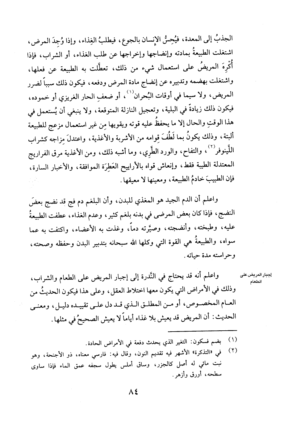 الْجَذْبُ إِلَى الْمَعِدَةِ، فَيُحِسَّ الْإِنْسَانُ بِالْجَوْعِ، فَيَطْلُبُ الْغِذَاءَ، وَإِذَا وُجِدَ الْمَرَضُ اشْتَغَلَتِ الطَّبِيعَةُ بِمَادَّتِهِ وَإِنْضَاجِهَا وَإِخْرَاجِهَا عَنْ طَلَبِ الْغِذَاءِ أَوِ الشَّرَابِ، فَإِذَا أُكْرِهَ الْمَرِيضُ عَلَى اسْتِعْمَالِ شَيْءٍ مِنْ ذَلِكَ، تَعَطَّلَتْ بِهِ الطَّبِيعَةُ عَنْ فِعْلِهَا، وَاشْتَغَلَتْ بِهَضْمِهِ وَتَدْبِيرِهِ عَنْ إِنْضَاجِ مَادَّةِ الْمَرَضِ وَدَفْعِهِ، فَيَكُونُ ذَلِكَ سَبَبًا لِضَرَرِ الْمَرِيضِ، وَلَا سِيَّمَا فِي أَوْقَاتِ الْبُحْرَانِ، أَوْ ضَعْفِ الْحَارِّ الْغَرِيزِيِّ أَوْ خُمُودِهِ، فَيَكُونُ ذَلِكَ زِيَادَةً فِي الْبَلِيَّةِ، وَتَعْجِيلِ النَّازِلَةِ الْمُتَوَقَّعَةِ، وَلَا يَنْبَغِي أَنْ يُسْتَعْمَلَ فِي هَذَا الْوَقْتِ وَالْحَالِ إِلَّا مَا يَحْفَظُ عَلَيْهِ قُوَّتَهُ وَيُقَوِّيهَا مِنْ غَيْرِ اسْتِعْمَالٍ مُزْعِجٍ لِلطَّبِيعَةِ الْبَتَّةَ، وَذَلِكَ يَكُونُ بِمَا لَطُفَ قِوَامُهُ مِنَ الْأَشْرِبَةِ وَالْأَغْذِيَةِ، وَاعْتَدَلَ مِزَاجُهُ كَشَرَابِ اللَّيْنُوفَرِ، وَالتِّفَّاحِ وَالْوَرْدِ الطَّرِيِّ، وَمَا أَشْبَهَ ذَلِكَ، وَمِنَ الْأَغْذِيَةِ مَرَقُ الْفَرَارِيجِ الْمُعْتَدِلَةِ الطَّيِّبَةِ فَقَطْ، وَإِنْعَاشُ قُوَاهُ بِالْأَرَايِيحِ الْعَطِرَةِ الْمُوَافِقَةِ، وَالْأَخْبَارِ السَّارَّةِ، فَإِنَّ الطَّبِيبَ خَادِمُ الطَّبِيعَةِ وَمُعِينُهَا لَا مُعِيقُهَا.