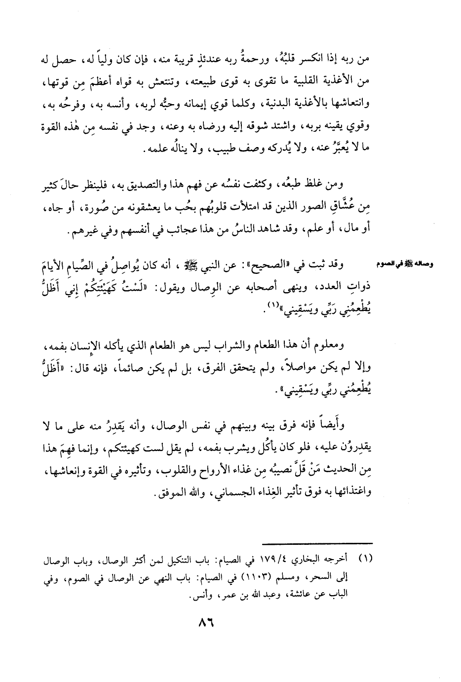 وَمَعْلُومٌ أَنَّ هَذَا الطَّعَامَ وَالشَّرَابَ لَيْسَ هُوَ الطَّعَامَ الَّذِي يَأْكُلُهُ الْإِنْسَانُ بِفَمِهِ، وَإِلَّا لَمْ يَكُنْ مُوَاصِلًا وَلَمْ يَتَحَقَّقِ الْفَرْقُ، بَلْ لَمْ يَكُنْ صَائِمًا، فَإِنَّهُ قَالَ: ( «أَظَلُّ يُطْعِمُنِي رَبِّي وَيَسْقِينِي» )