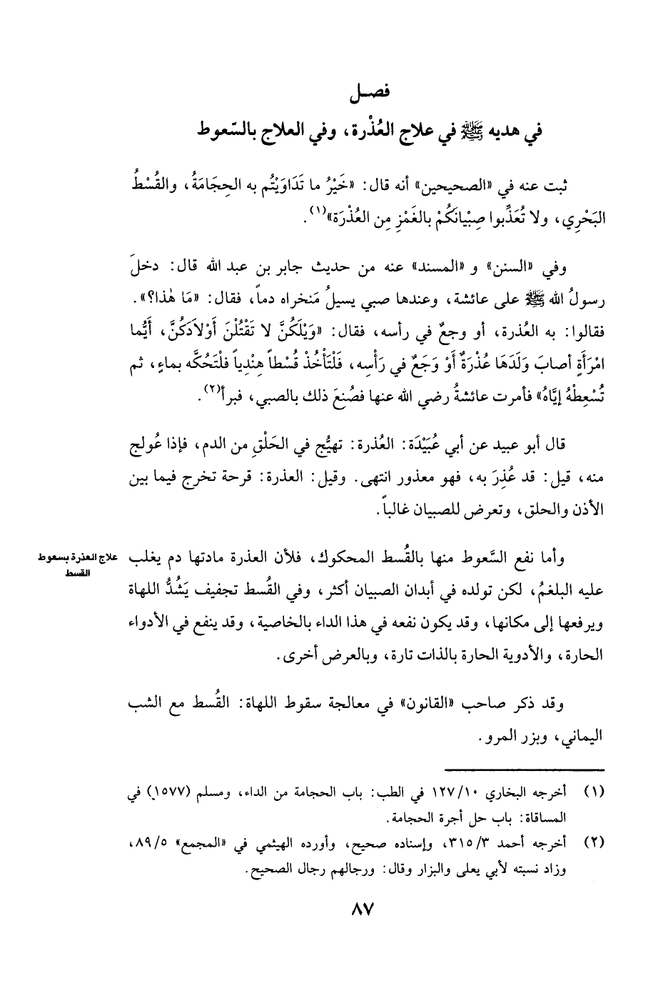 فَصْلٌ فِي هَدْيِهِ صَلَّى اللَّهُ عَلَيْهِ وَسَلَّمَ فِي عِلَاجِ الْعُذْرَةِ، وَفِي الْعِلَاجِ بِالسَّعُوطِ